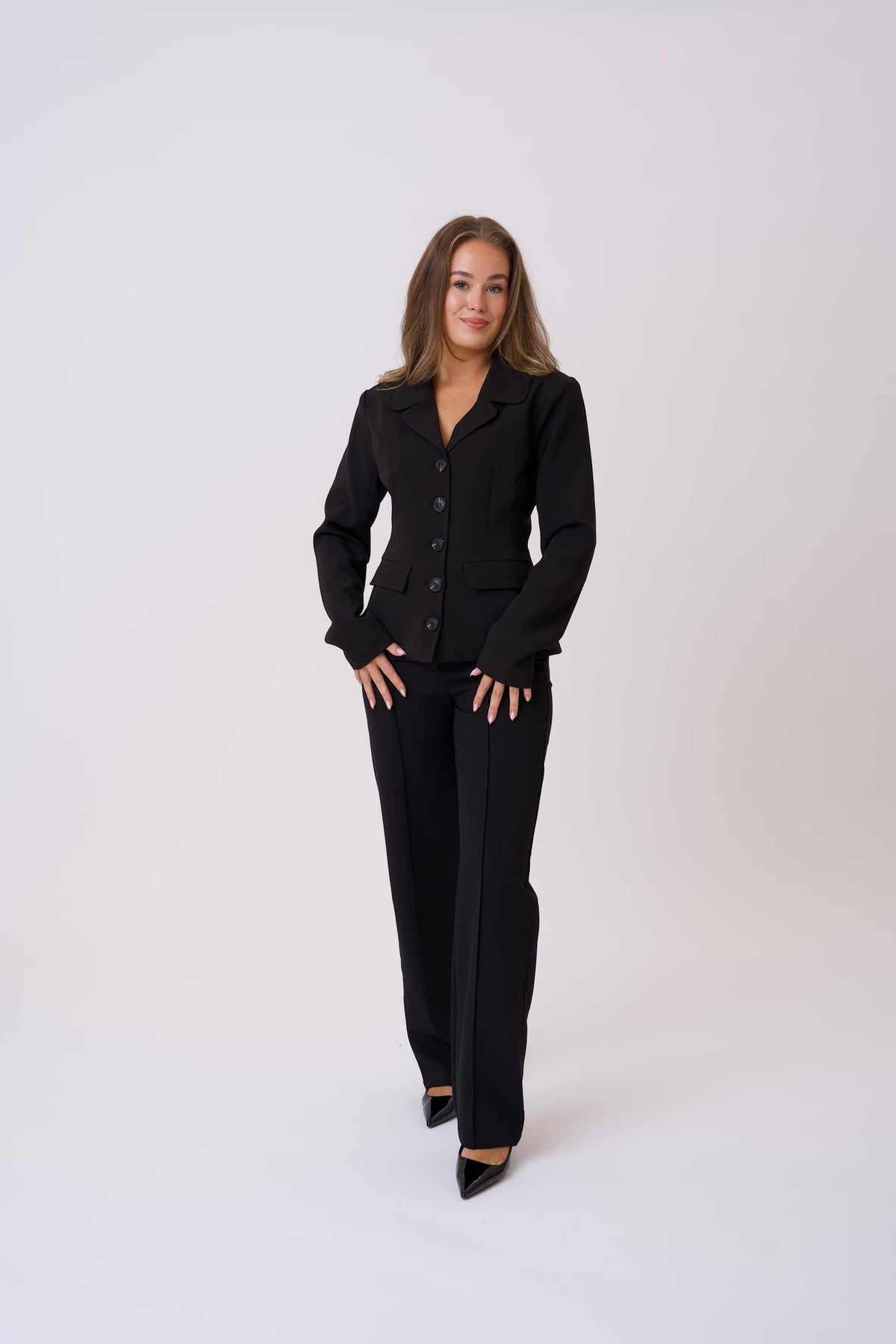 Blazer noir de BYIC avec coupe slim fit. Le blazer a un col classique, des boutons de couleur naturelle et deux poches à rabat à l'avant. Le tissu structuré donne une taille marquée.