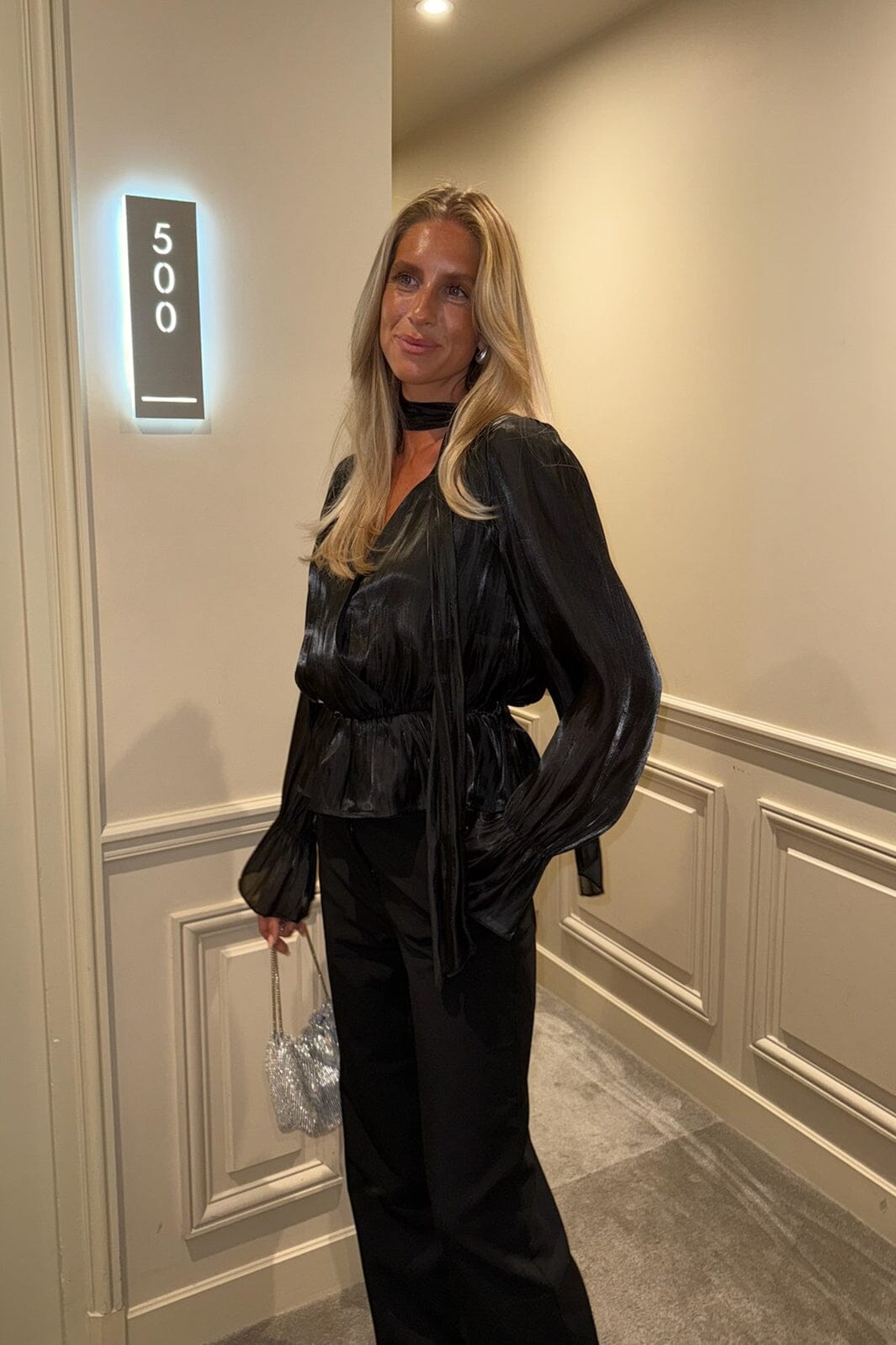 Chemise noire de BYIC avec surface brillante. La chemise a une coupe ample avec taille marquée et un décolleté en V profond avec détail croisé.