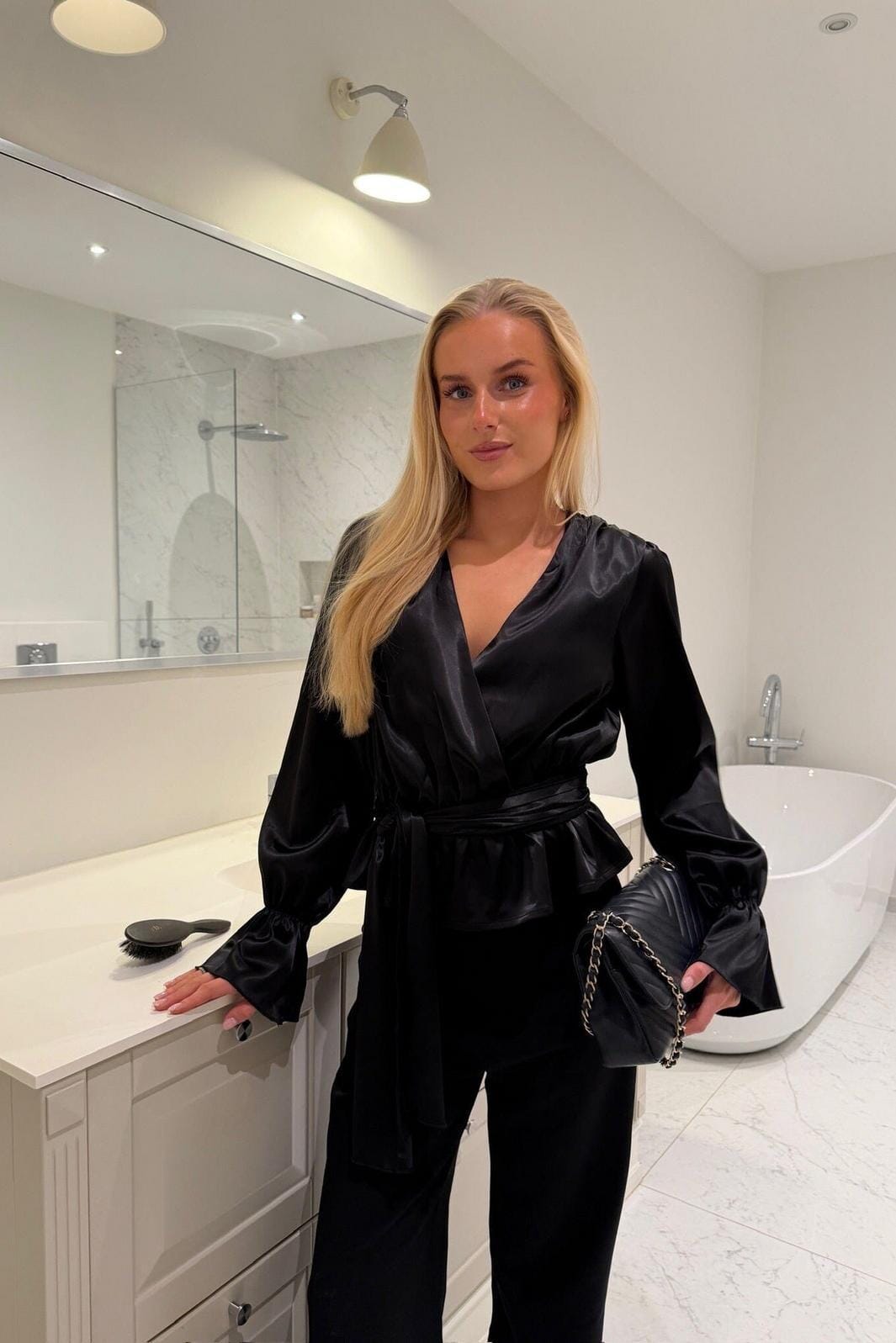 Chemise en satin noir de BYIC avec décolleté en V et lien à nouer. La chemise a une coupe ample avec taille marquée et des manches bouffantes avec des poignets élastiques.