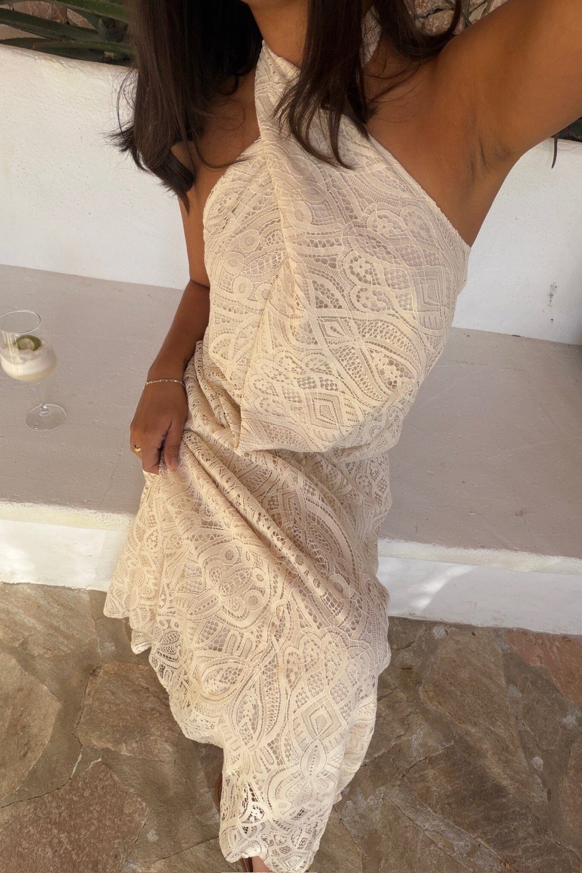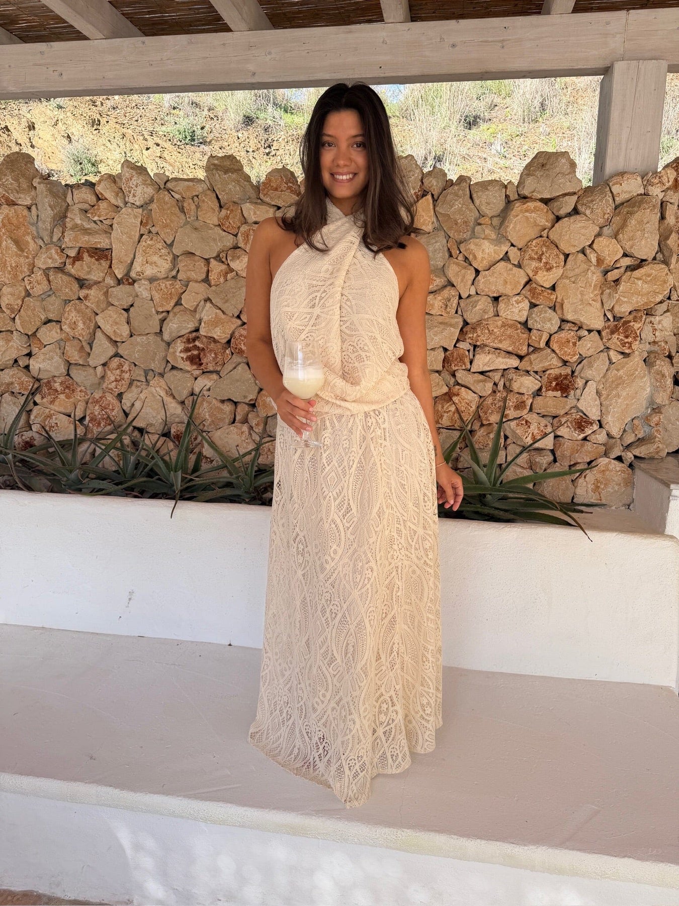 Top portefeuille BYIC en blanc cassé avec dentelle. Le top présente un style dos-nu avec lien à nouer dans la nuque et un effet portefeuille sur le devant.