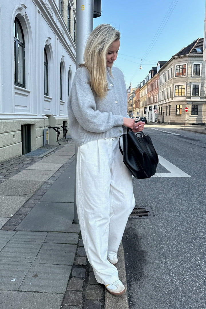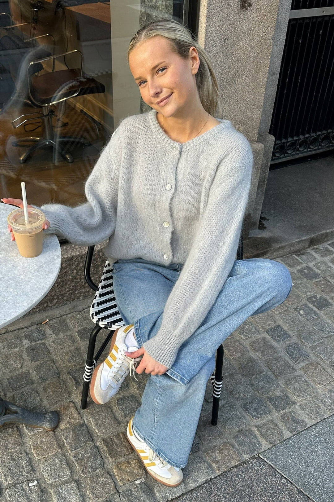 Cardigan gris avec des manches volumineuses et des boutons en nacre. Le tricot doux a une texture aérée et est stylé avec un t-shirt blanc en dessous.