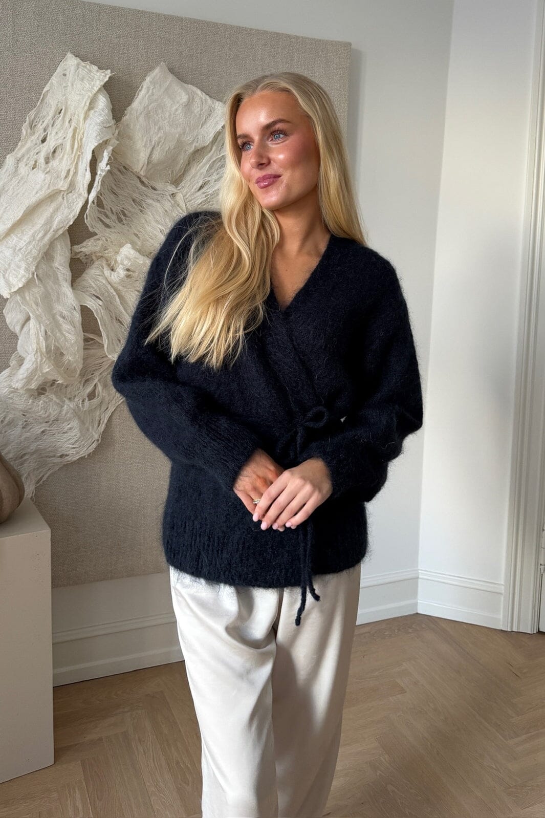Cardigan croisé bleu marine de BYIC avec une texture duveteuse. Le cardigan a un décolleté en V profond et une ceinture à la taille.