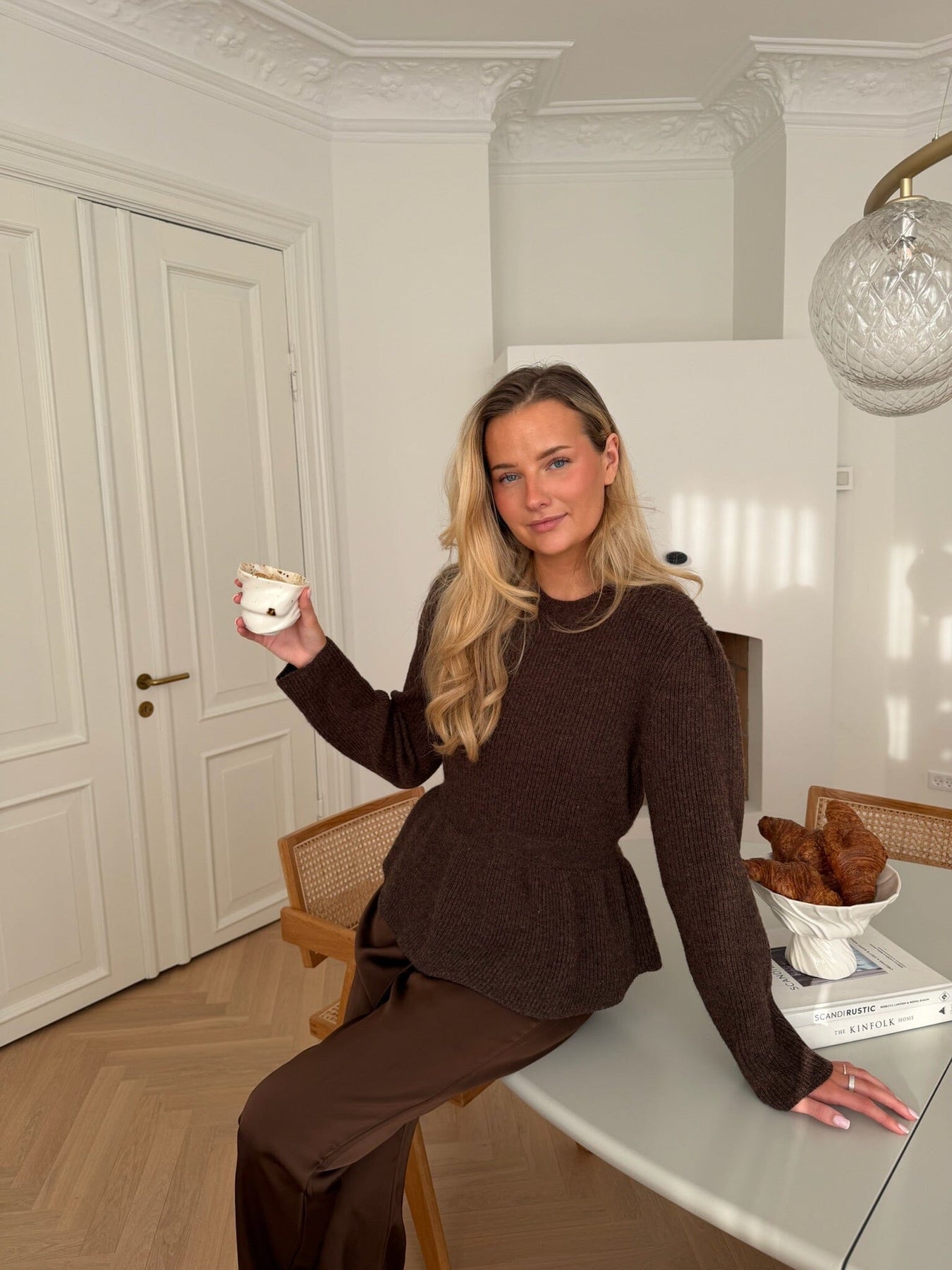 Pull marron foncé de BYIC avec texture en maille côtelée et effet basque à la taille. Le pull présente une coupe slim fit et un col rond.