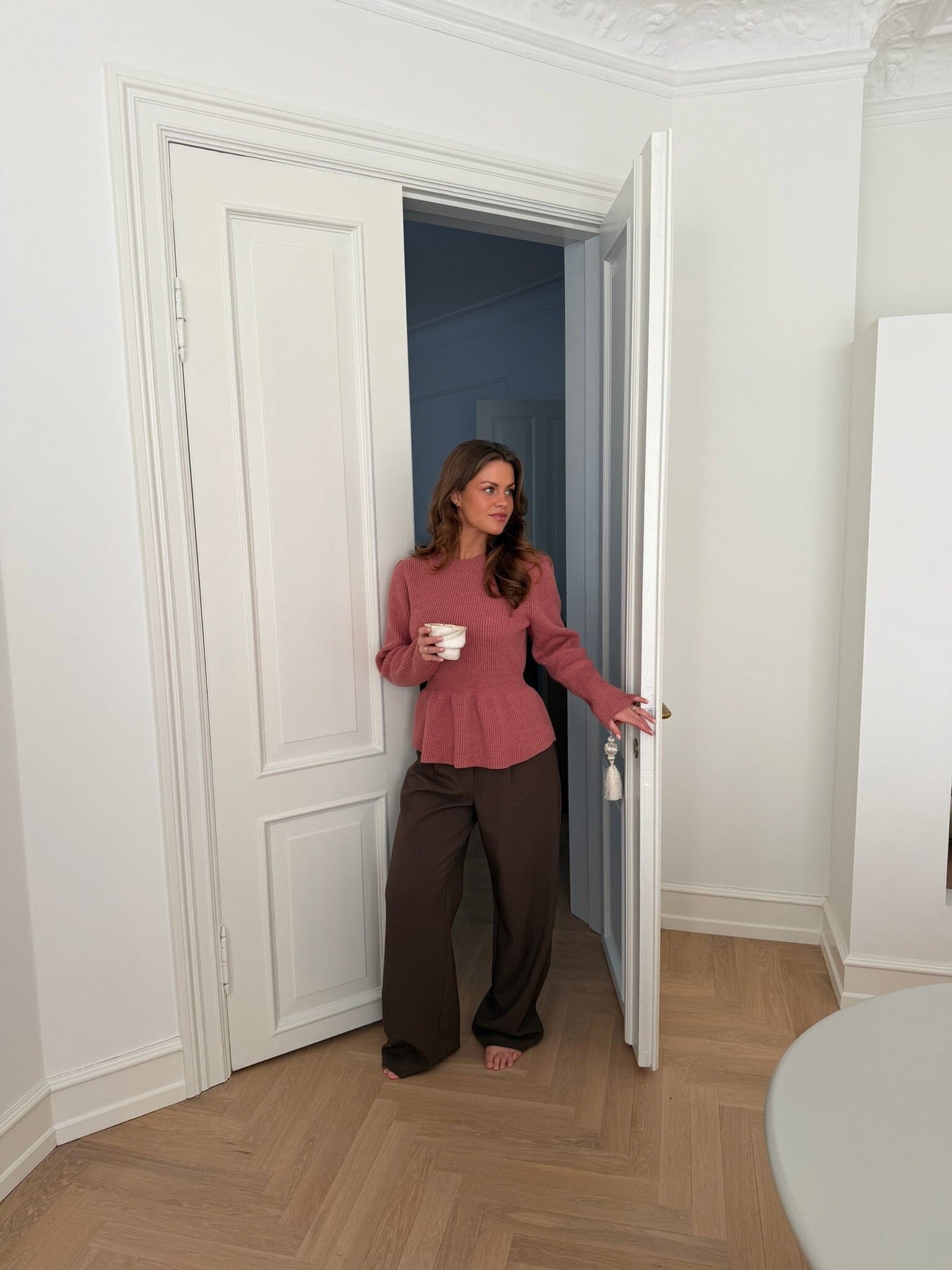 Un pull rose de BYIC avec un effet peplum à la taille. Le pull présente une texture en maille côtelée et une coupe slim fit.