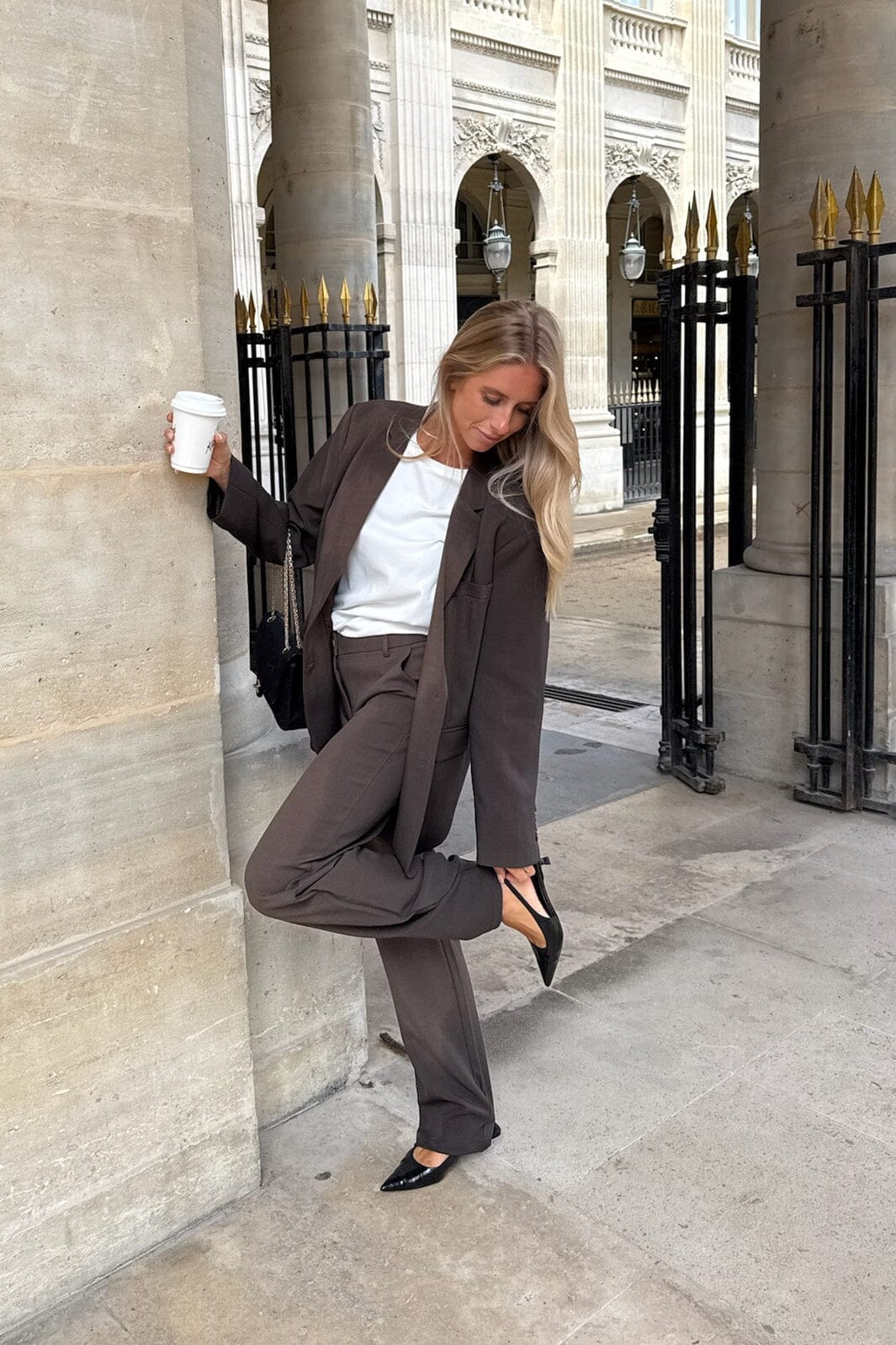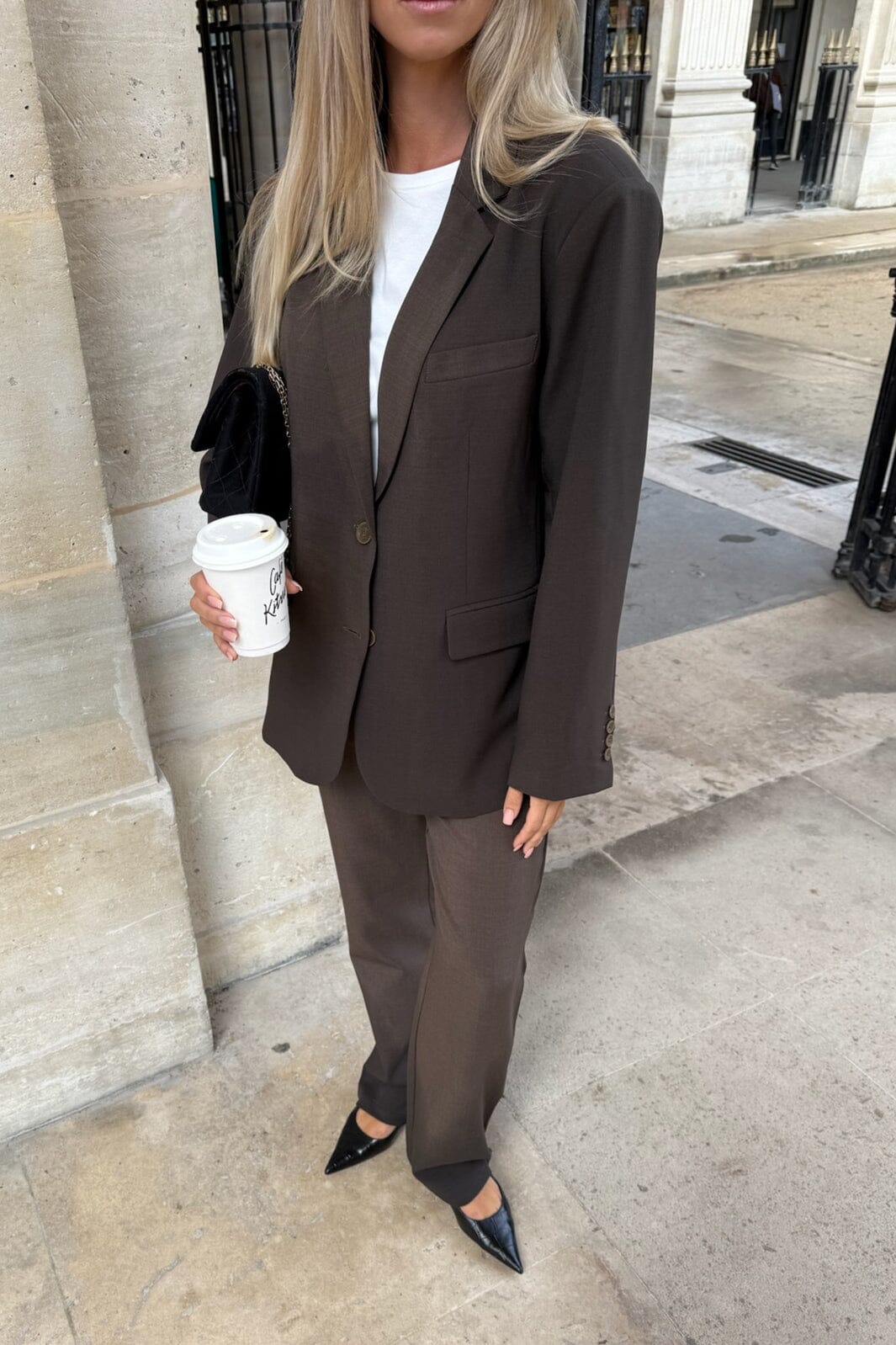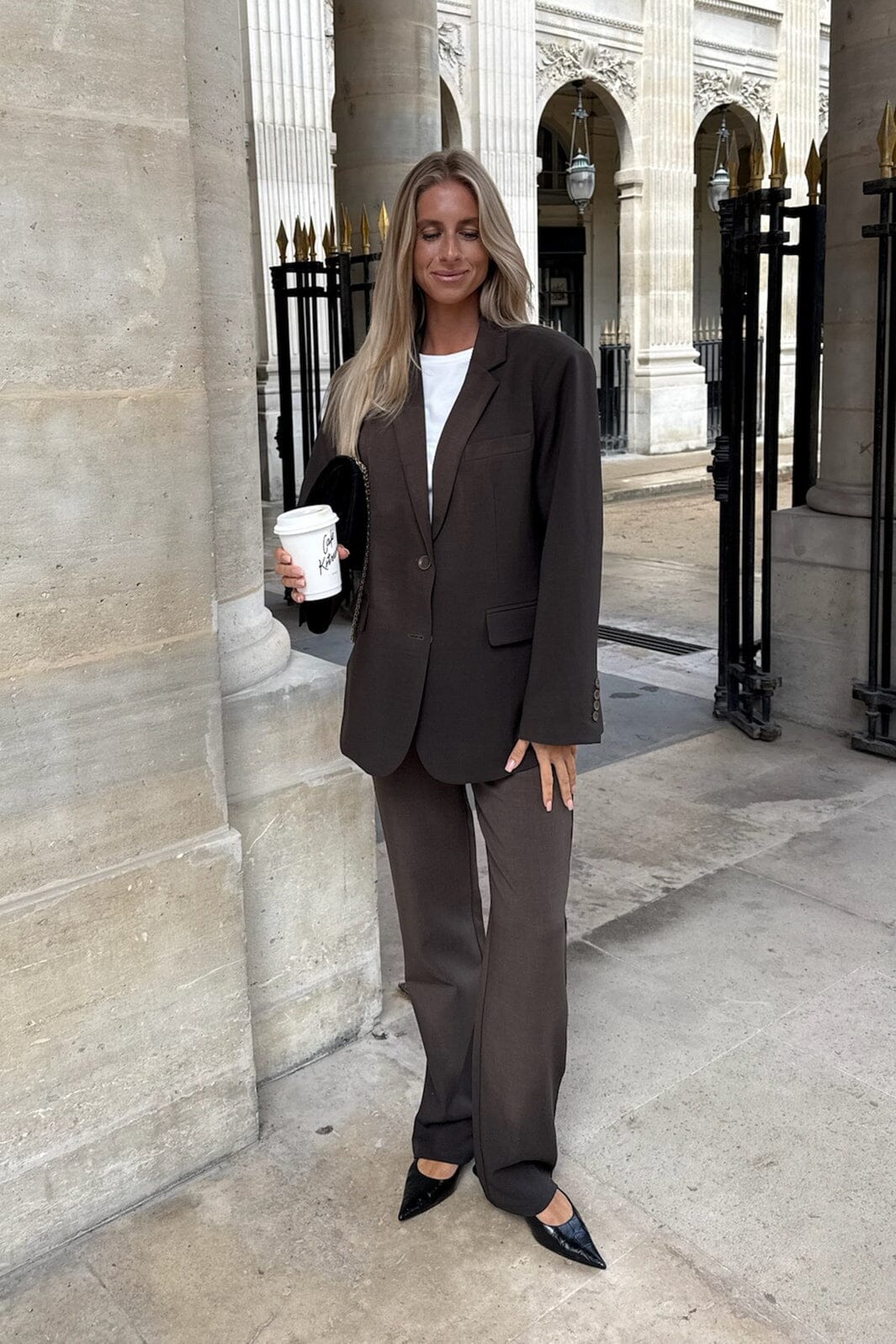 Blazer marron foncé de BYIC avec col en V et coupe droite. Il a un seul bouton à l'avant, des poches de chaque côté et une poche poitrine sur le côté gauche.