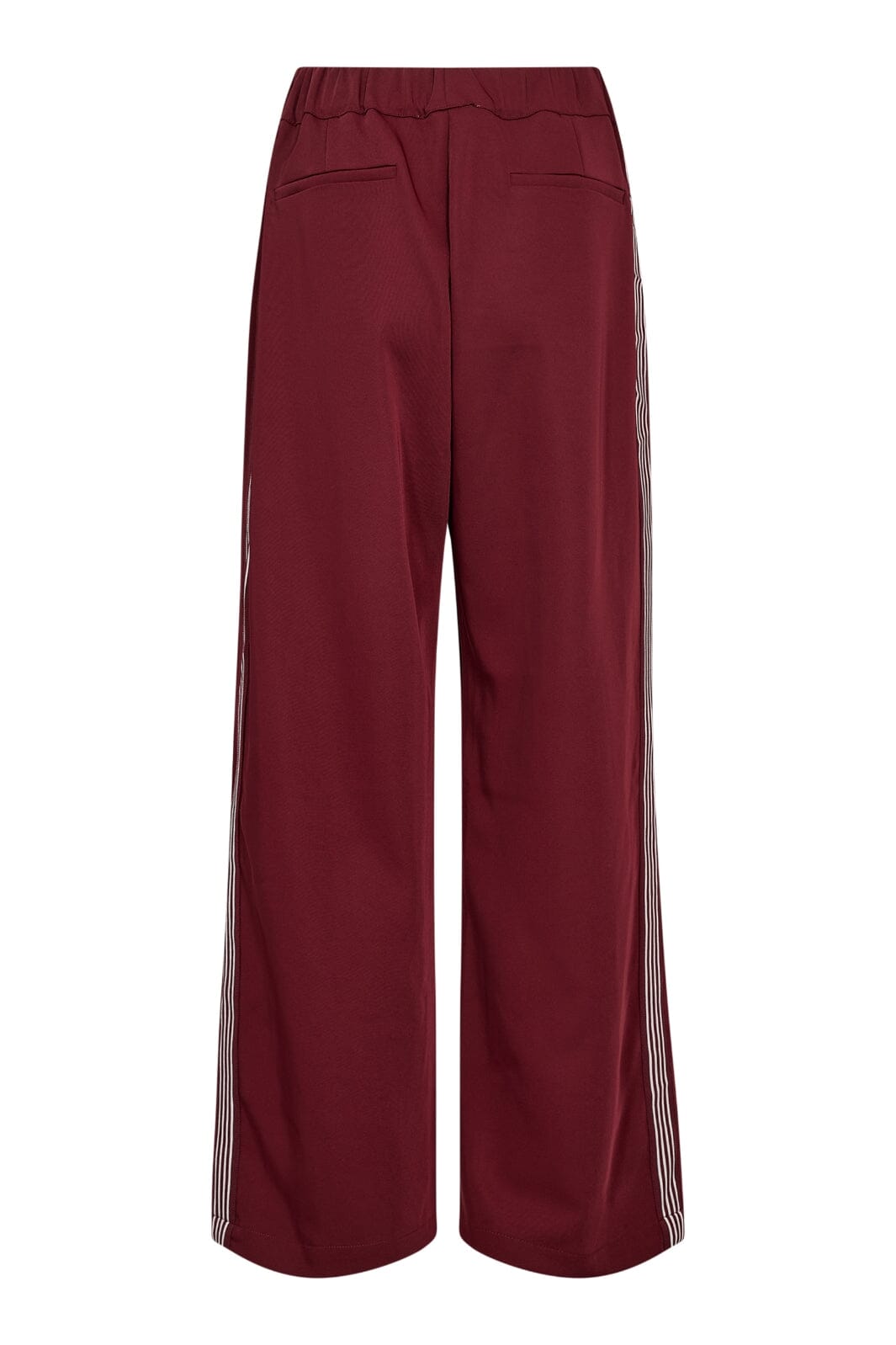 Pantalons de Co'Couture dans une profonde couleur bordeaux avec des rayures blanches sur les côtés. Ils ont une longueur cheville et sont équipés de coutures décoratives ainsi qu'une taille élastique.