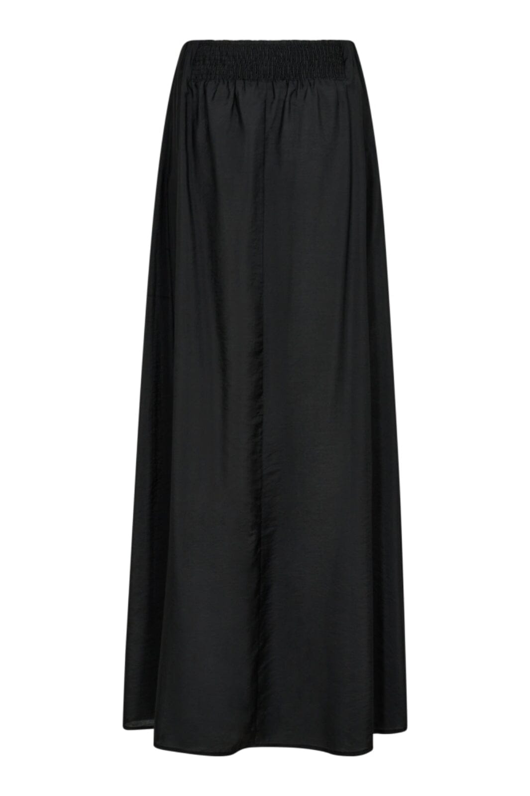 Robe tube noire de Co´Couture avec taille élastique et design off-shoulder. La robe est longue et a une chute fluide qui se déplace avec le corps.