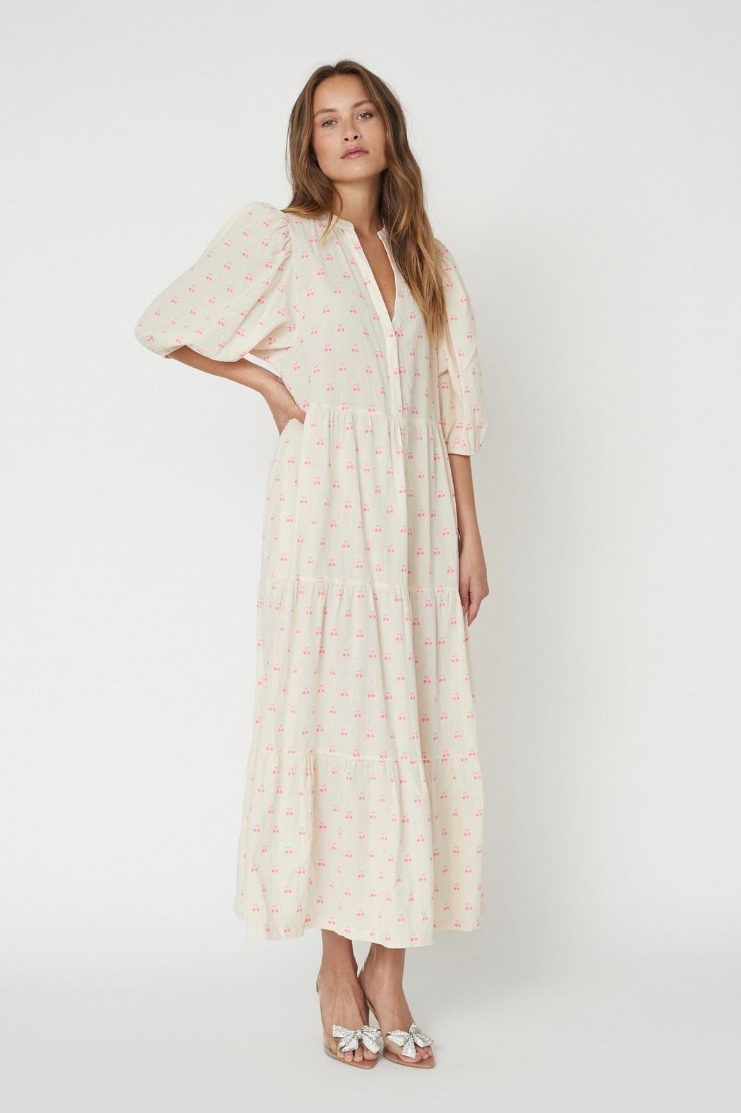 Robe longue de Co'Couture avec un fond beige et un motif de cerises néon rose. La robe a un décolleté en V avec des volants et des manches bouffantes 3/4.