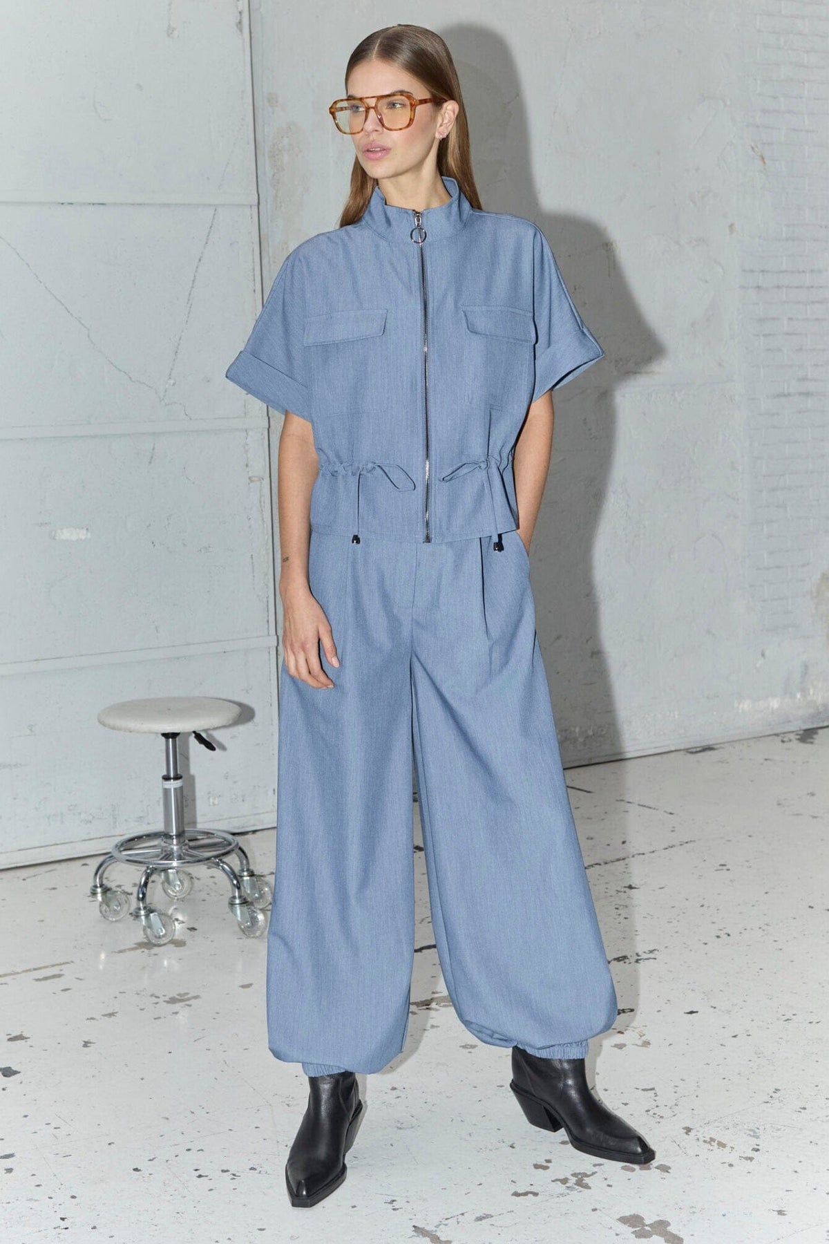 Gilet bleu poussiéreux de Co´Couture, confectionné dans un mélange de polyester, de viscose et d’élasthanne. Le gilet possède une fermeture zippée sur le devant et un cordon de serrage à la taille.