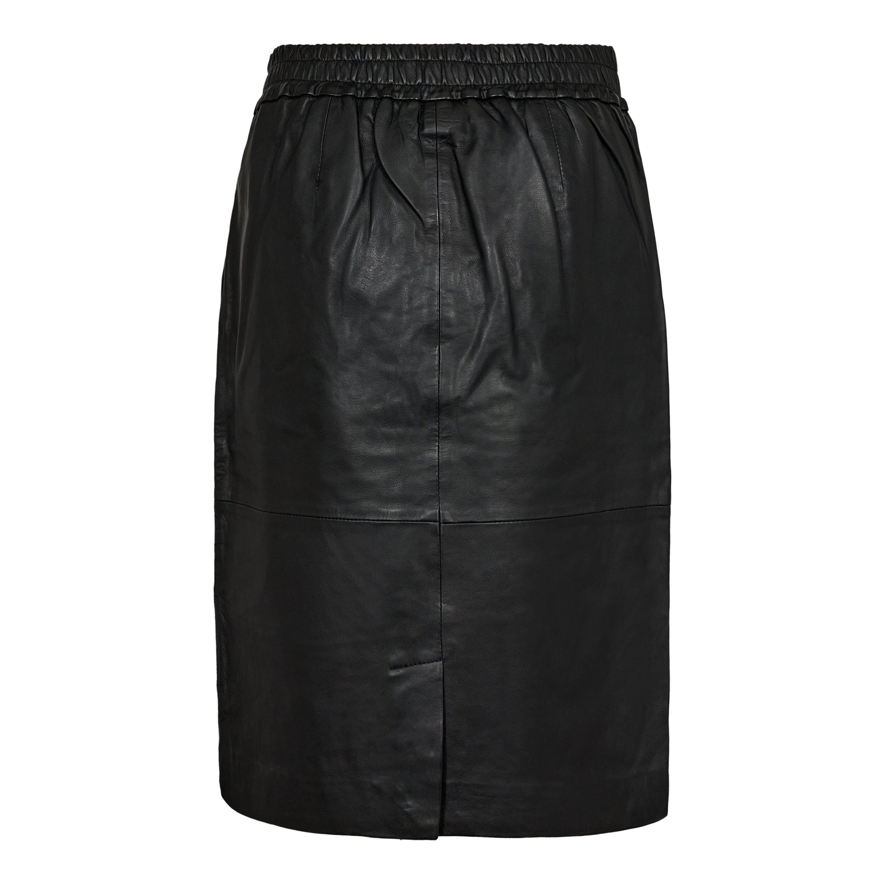 Jupe en cuir noir avec coupe crayon et taille élastique. La jupe est de longueur genou et a une coupe régulière qui la rend utilisable aussi bien pour le quotidien que pour les occasions festives.
