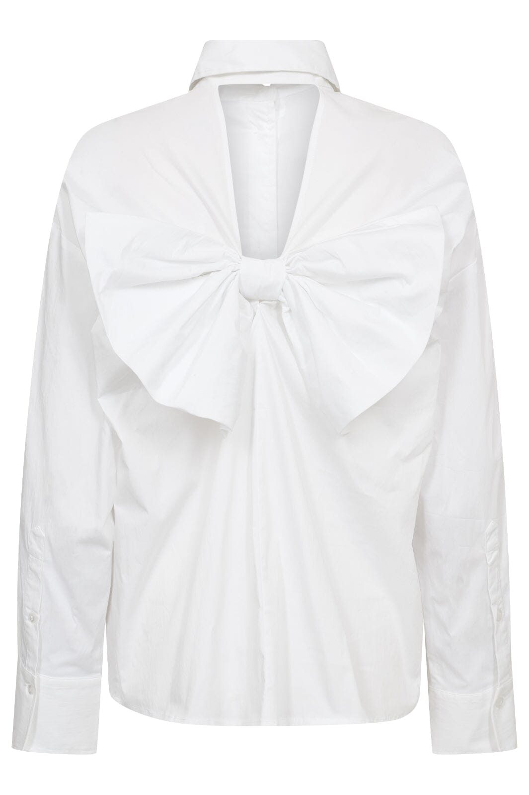 Chemise blanche de Co'Couture avec un grand nœud dans le dos et un dos ouvert. Elle combine des détails de chemise classiques avec un design de dos marqué.