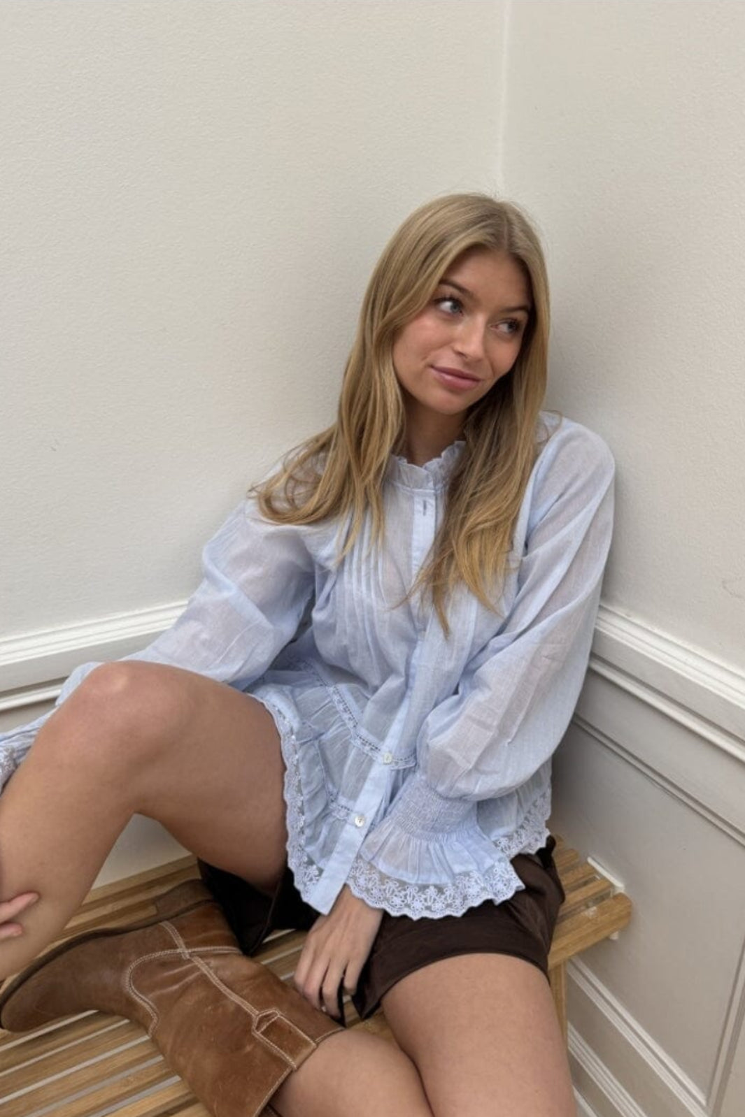 Blouse bleu clair à manches longues de la marque Continue, confectionnée en 100 % coton uni avec col chemise.