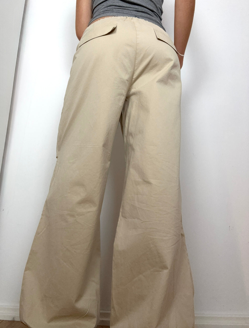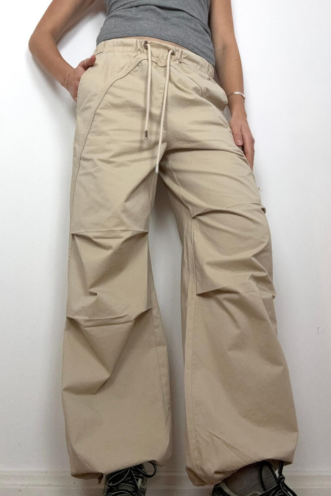 Pantalon beige de la marque Continue dans une nuance sable. Le pantalon présente une coupe ample avec des coutures décoratives et un cordon de serrage à la taille.