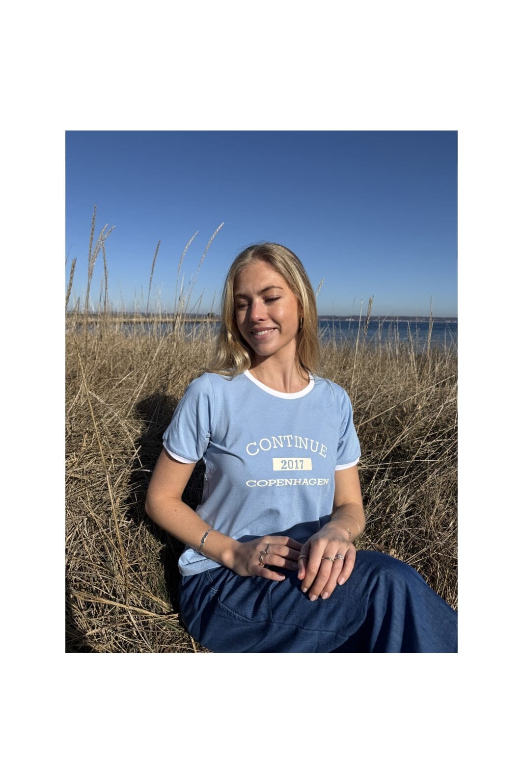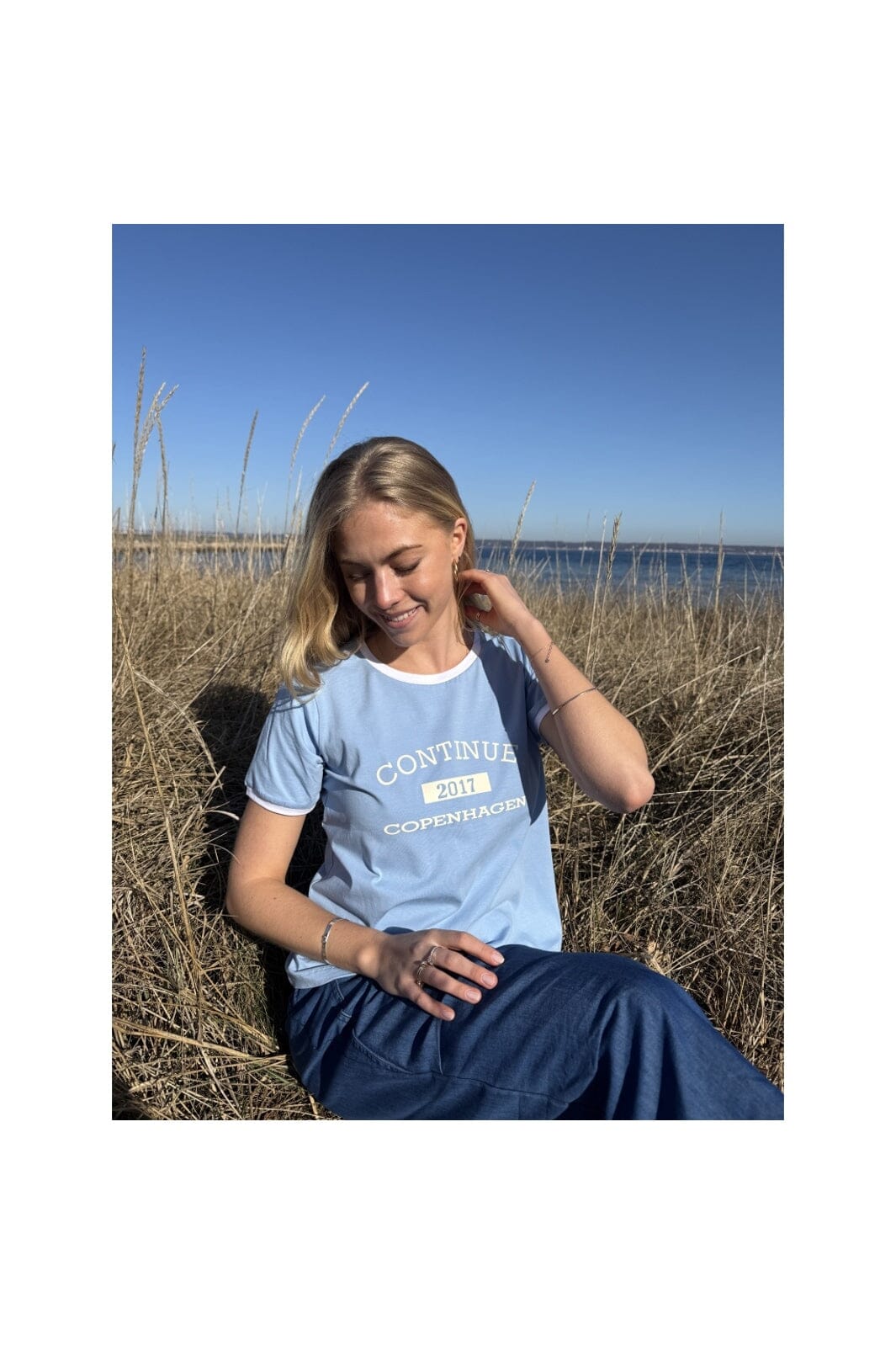 T-shirt bleu clair de la marque Continue avec des bordures blanches au niveau du col et des manches. Il présente un imprimé avec le texte CONTINUE 2017 COPENHAGEN sur le devant.