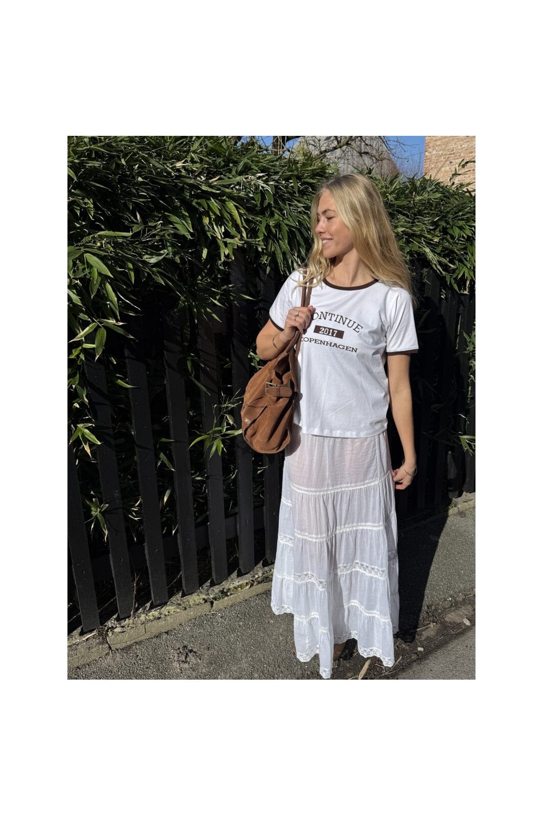 T-shirt blanc de la marque Continue avec des bordures marron au niveau du col et des manches. Confectionné en coton avec des coutures décoratives et un imprimé.