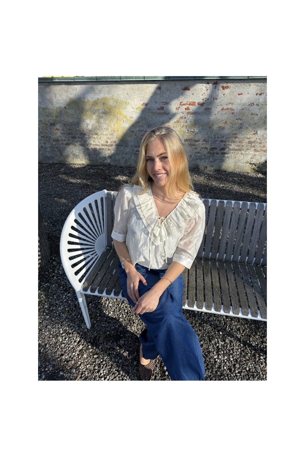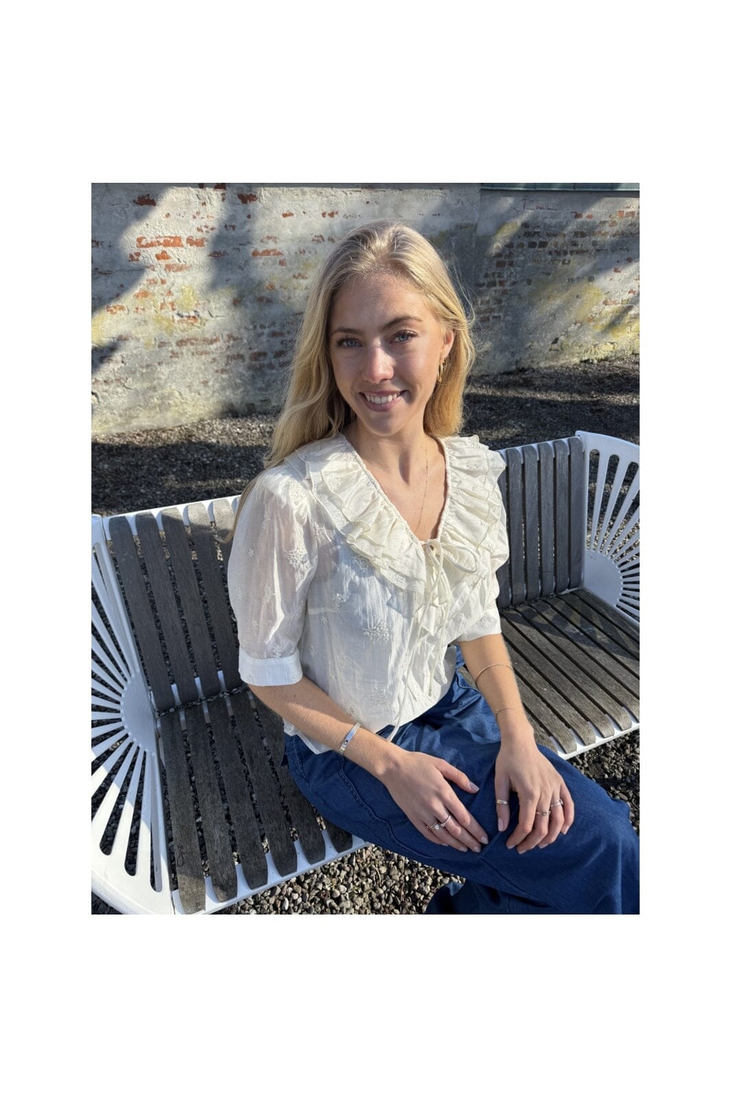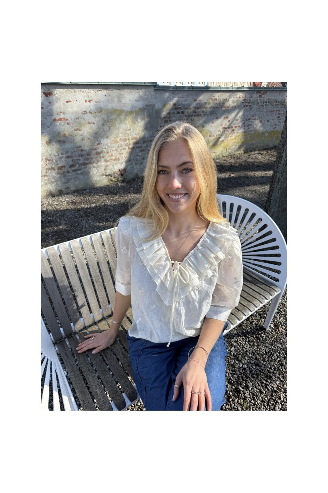 Blouse crème de la marque Continue avec encolure en V, manches 3/4 et broderie. La blouse présente des détails à volants et un lien à nouer au niveau de l’encolure.