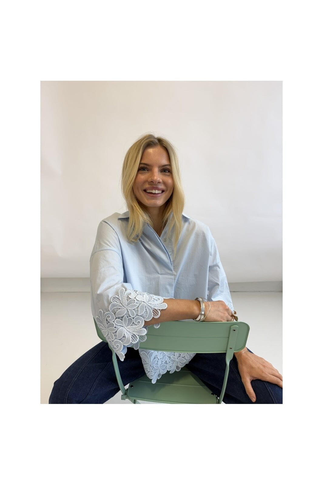 Chemise bleu clair de la marque Continue, en coton avec des détails brodés et de la dentelle. La chemise présente une coupe ample et des manches trois-quarts.