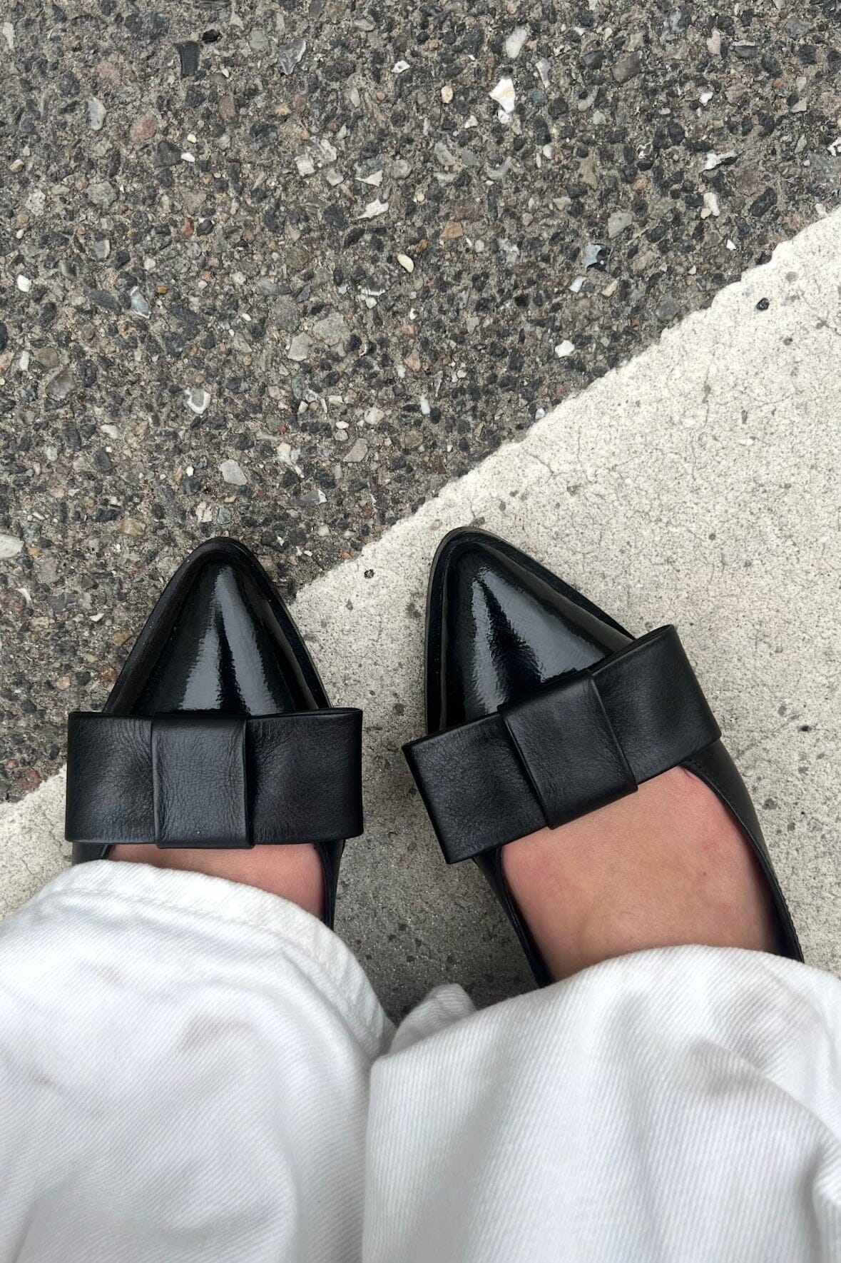 Escarpin slingback noir de Copenhagen Shoes, fabriqué en cuir et polyamide. La chaussure possède un bout pointu, un nœud décoratif et une bride avec boucle réglable.
