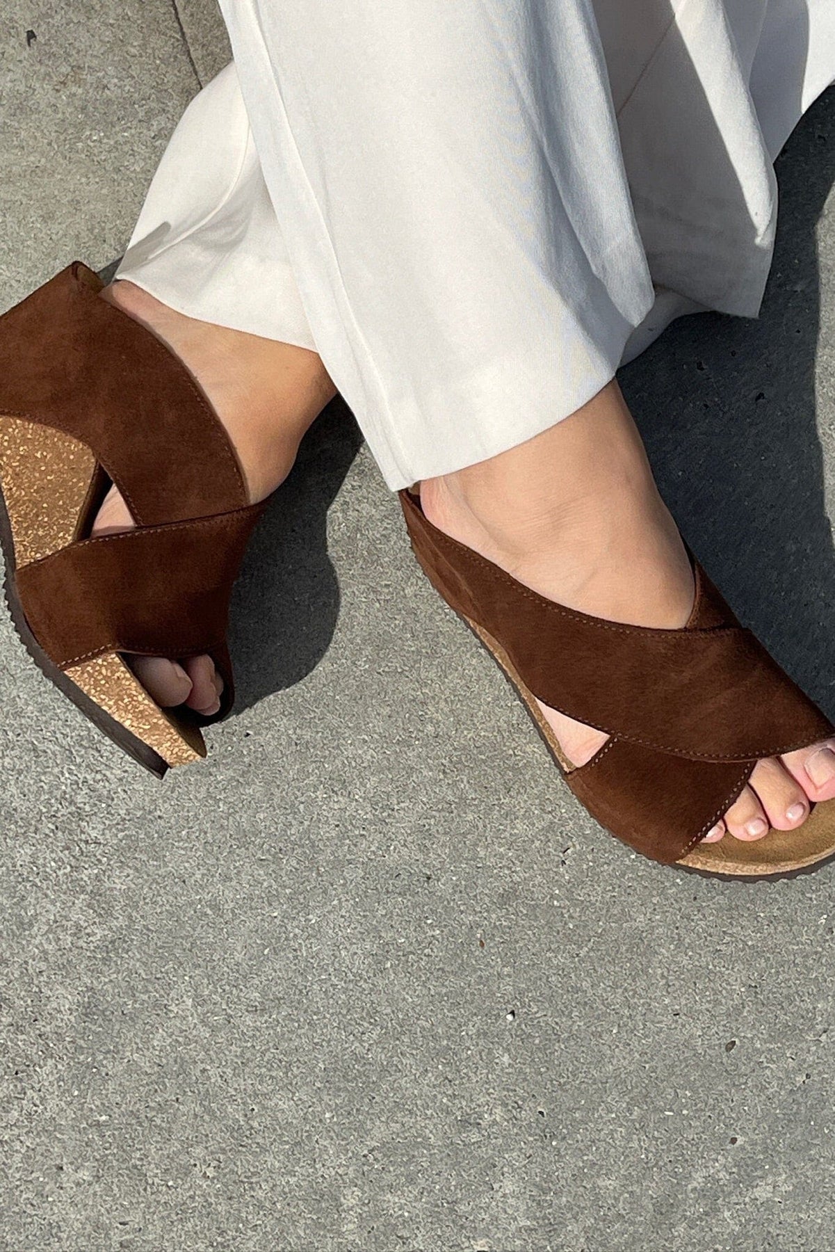 Sandales Copenhagen Shoes en doux daim italien dans une teinte brun foncé. Les sandales présentent un design croisé sur le dessus et un talon compensé.