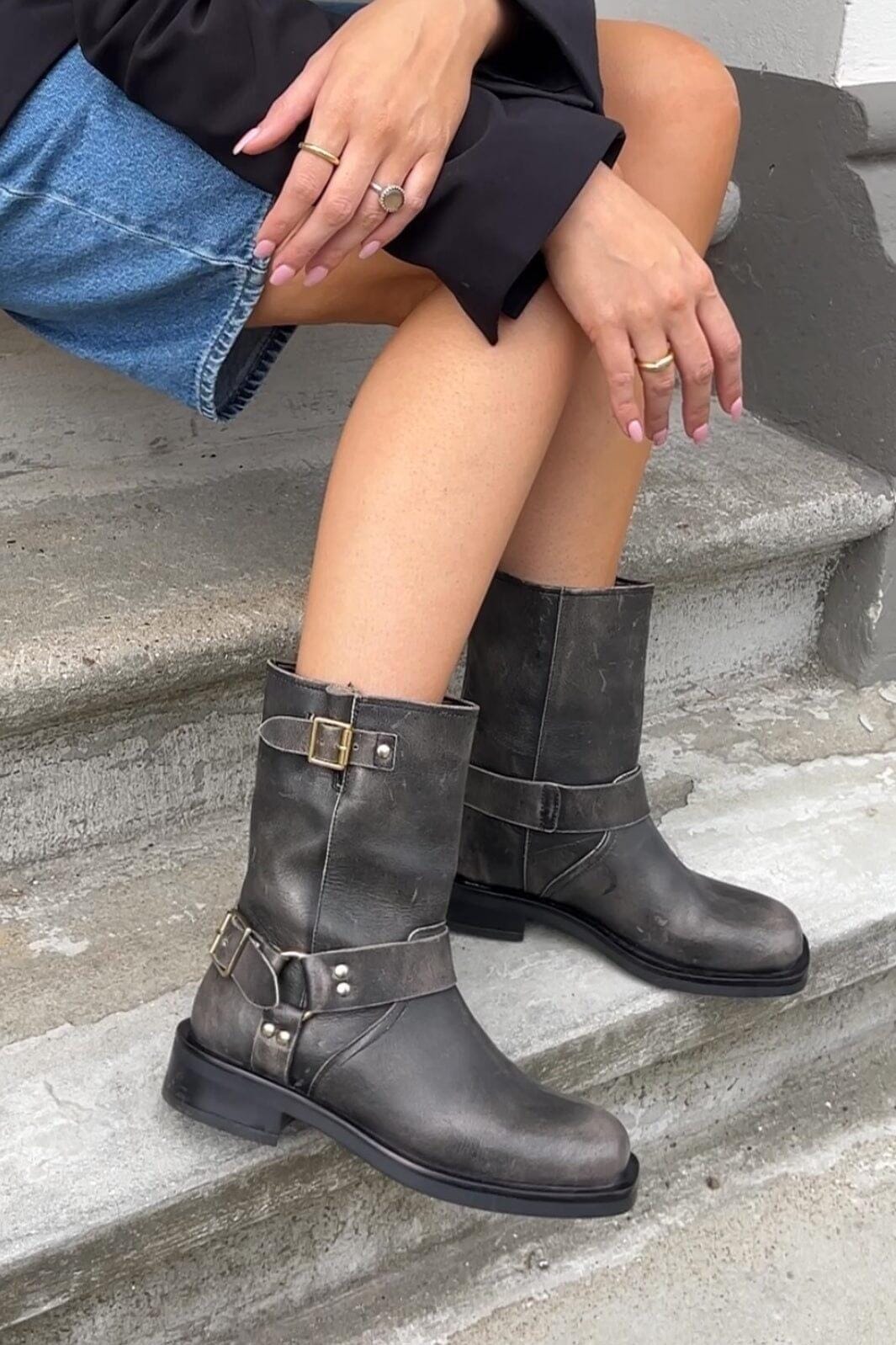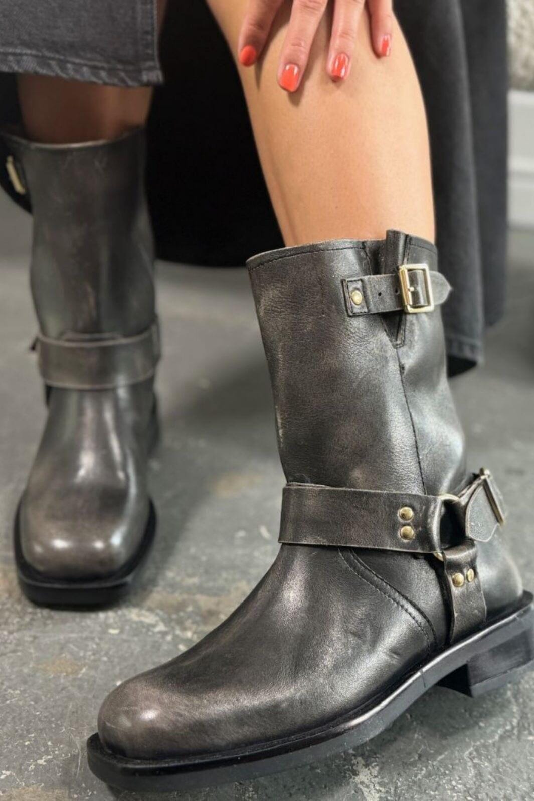Botte noire et grise de Copenhagen Shoes en cuir avec finition brillante. La botte a une fermeture à boucle avec des détails dorés et un bout carré.