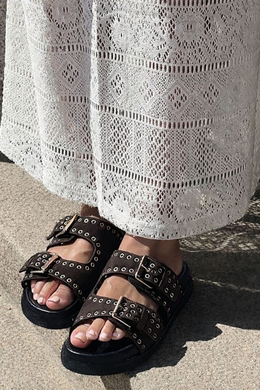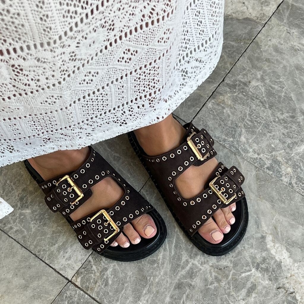 Sandales de Copenhagen Shoes en daim marron foncé avec brides doubles et détails en métal doré. Les boucles sont perforées le long des bords et créent un style affirmé.