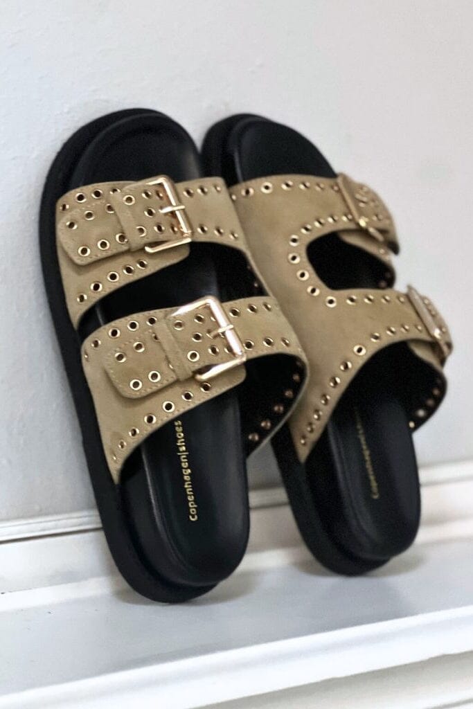 Sandales de Copenhagen Shoes en daim beige. Elles ont deux brides réglables avec boucles et des clous décoratifs le long des brides.