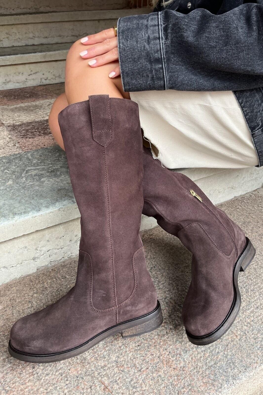 Bottes hautes en daim brun avec bout rond. La botte a un petit talon carré et une fermeture éclair sur le côté. La nuance brune donne à la botte une expression rustique.
