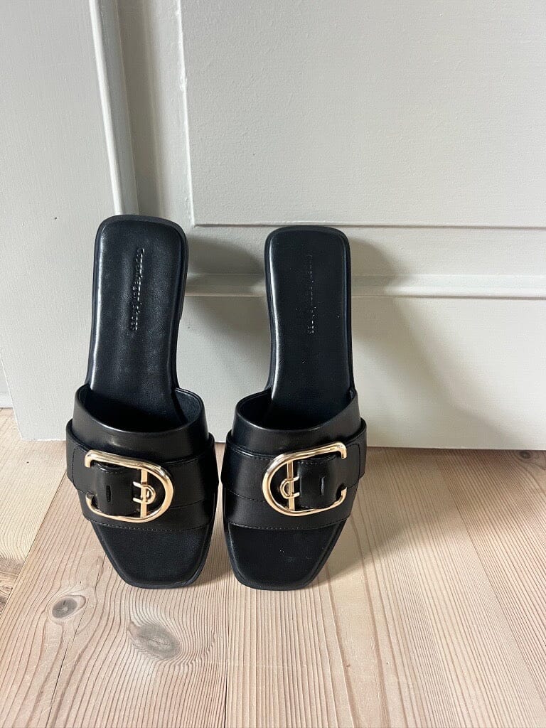 Sandale noire de Copenhagen Shoes, en cuir avec une semelle plate. La sandale possède une grande boucle décorative sur la bride à l’avant.