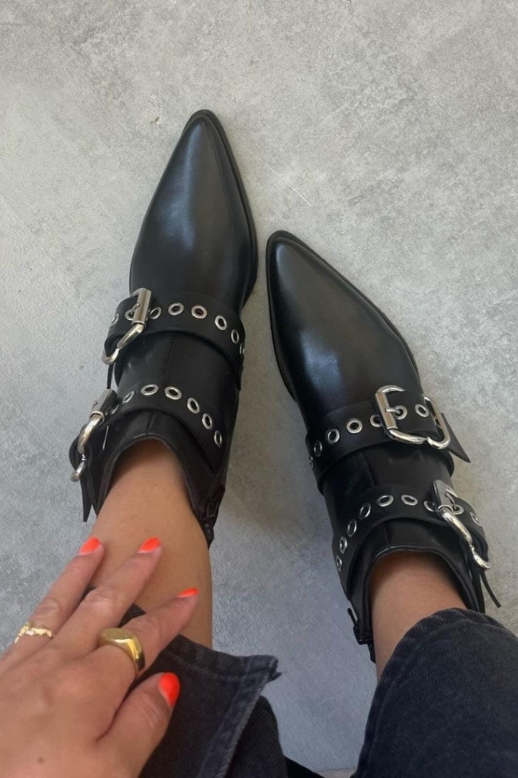 Bottes noires en cuir avec bout pointu. Les bottes ont des sangles décoratives avec des boucles en métal et des œillets, ainsi qu'une fermeture éclair pratique sur le côté.