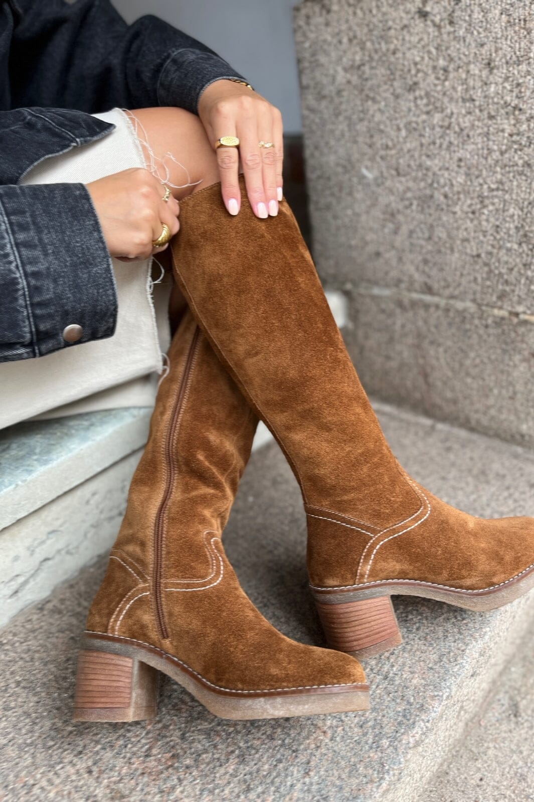 Bottes hautes de genoux de Copenhagen Shoes en daim brun. La botte a un talon bloc de 8-10 cm et une pointe ronde avec des coutures décoratives.