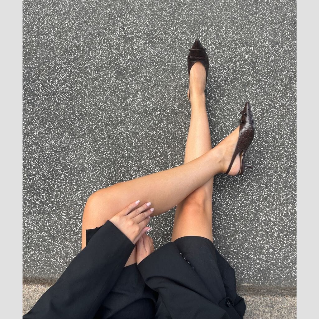 Escarpins slingback de Copenhagen Shoes en cuir marron foncé à motif crocodile. Les chaussures ont un bout pointu et un talon aiguille, et conviennent aux occasions festives et formelles.