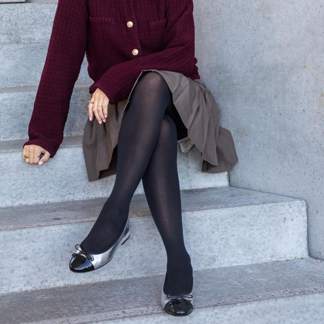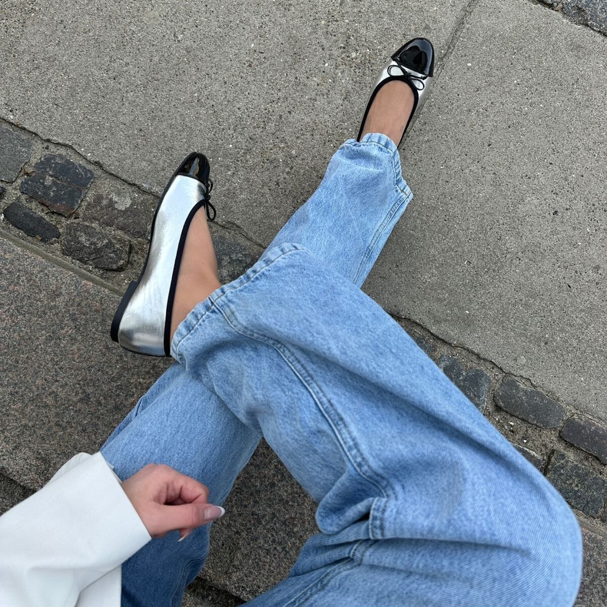 Ballerines en cuir métallisé argenté avec bout verni noir. Les chaussures ont une semelle Tunit et sont fabriquées avec une production durable, certifiée par le Leather Working Group.