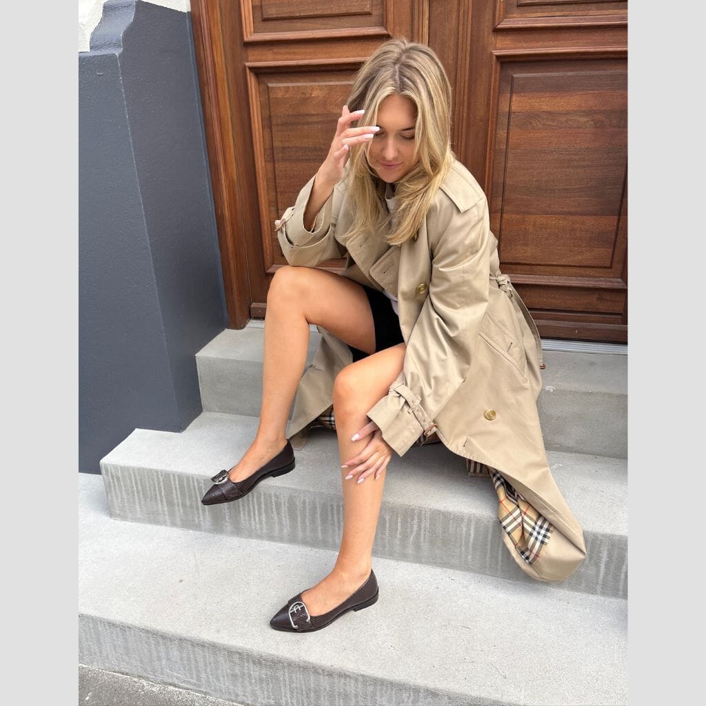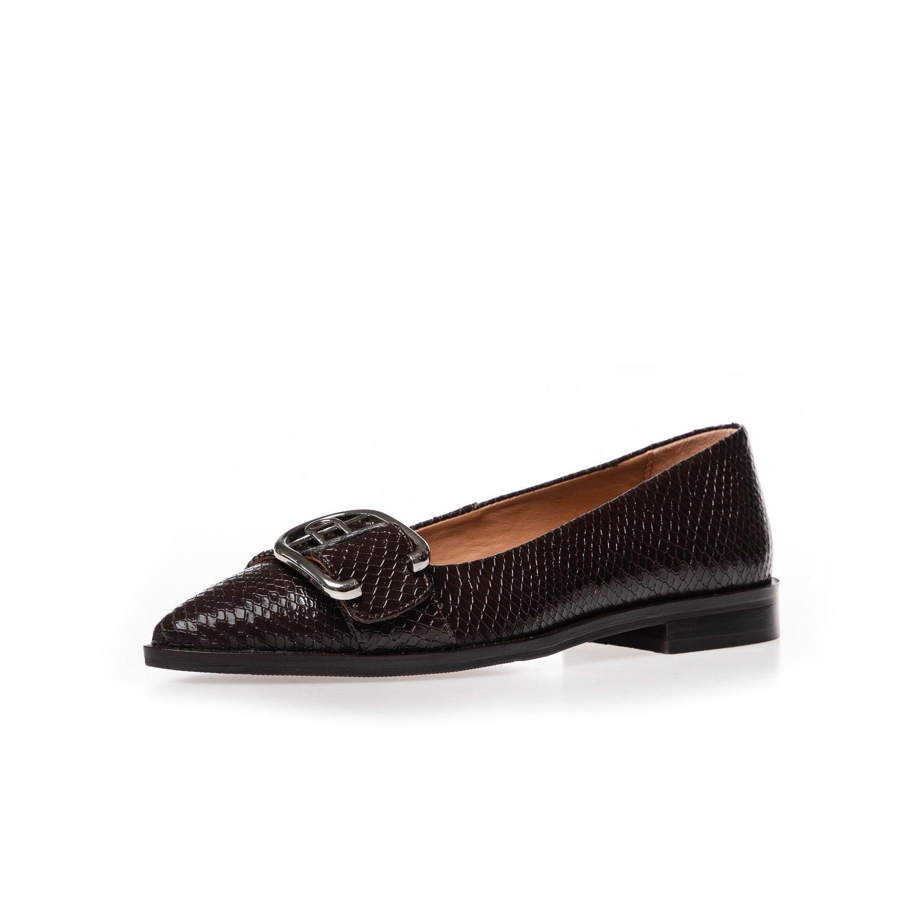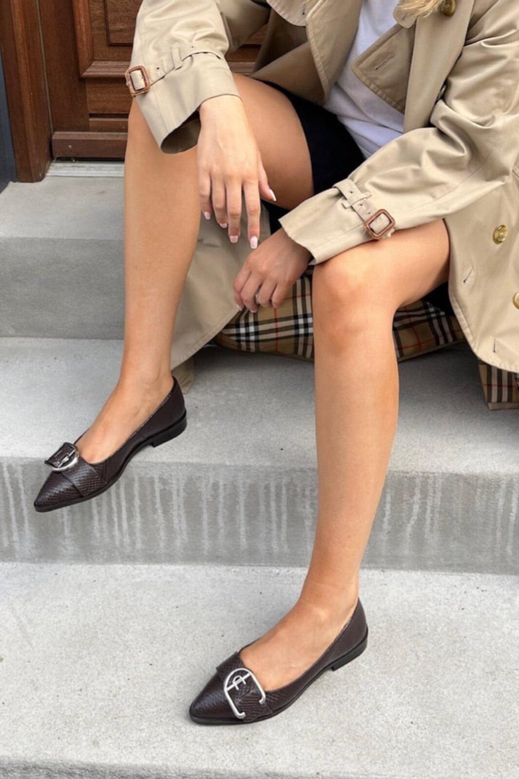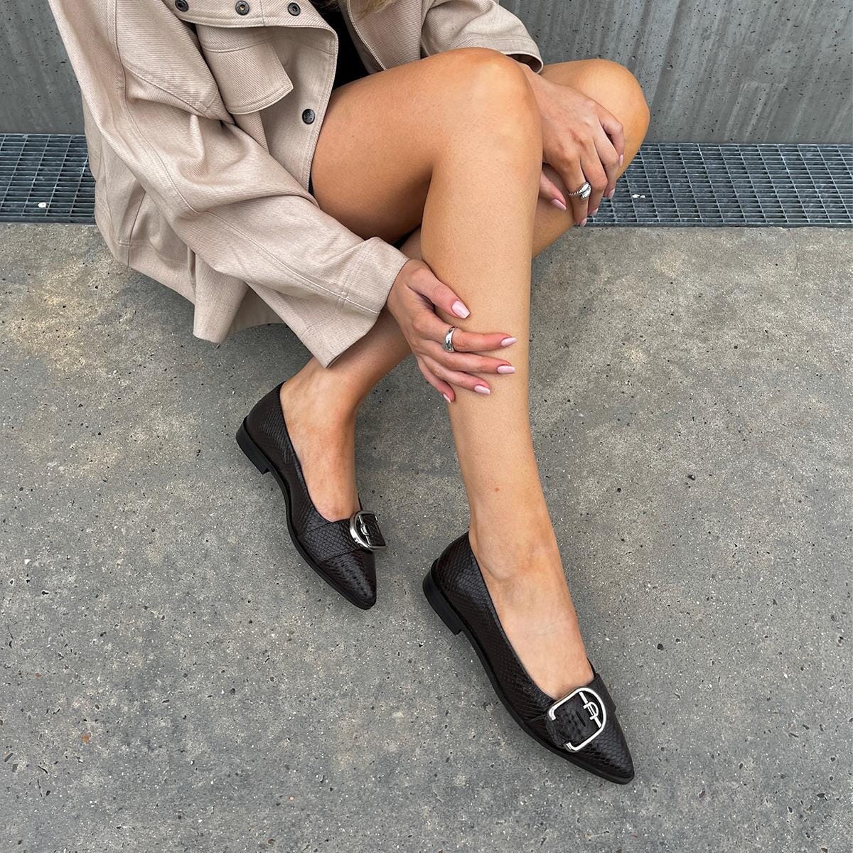 Chaussures plates de Copenhagen Shoes, en cuir de couleur brun foncé. La chaussure possède un bout pointu et une boucle apparente sur l’avant.
