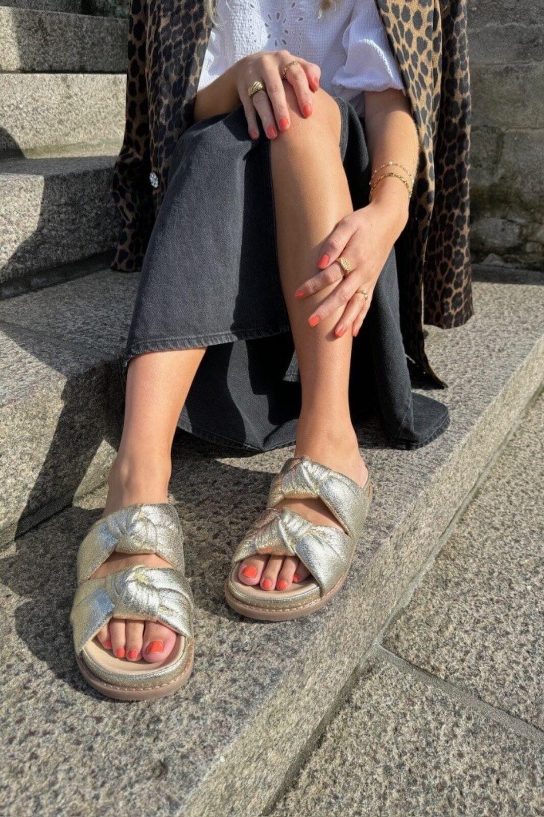 Sandales de Copenhagen Shoes en cuir avec une finition dorée/beige métallisée. Les lanières torsadées donnent aux sandales un caractère unique, et la semelle plate assure une bonne stabilité.