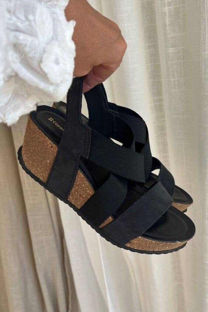 Sandale noire de Copenhagen Shoes avec des brides croisées en nubuck et élastique. La sandale a une semelle en liège et une semelle intérieure en mousse spécialement développée qui offre un bon soutien au pied.