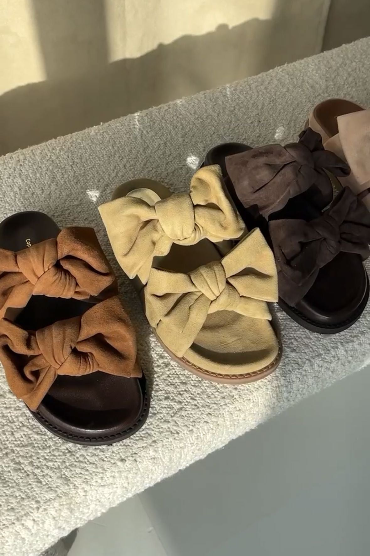 Sandales de Copenhagen Shoes en daim souple avec une finition couleur cognac. Le design présente deux grands nœuds décoratifs sur les brides.