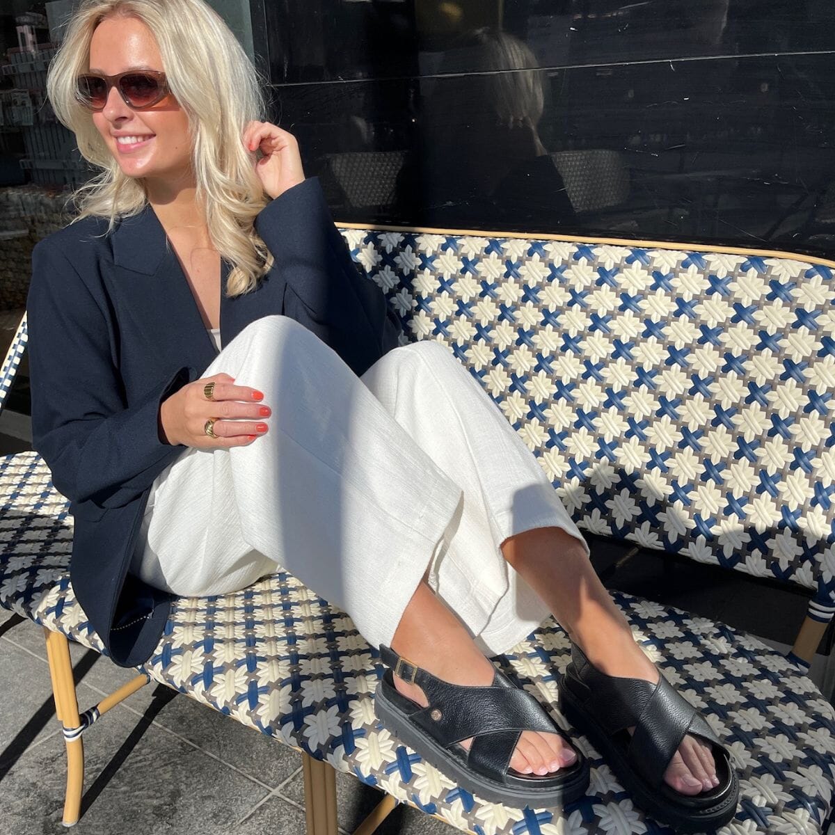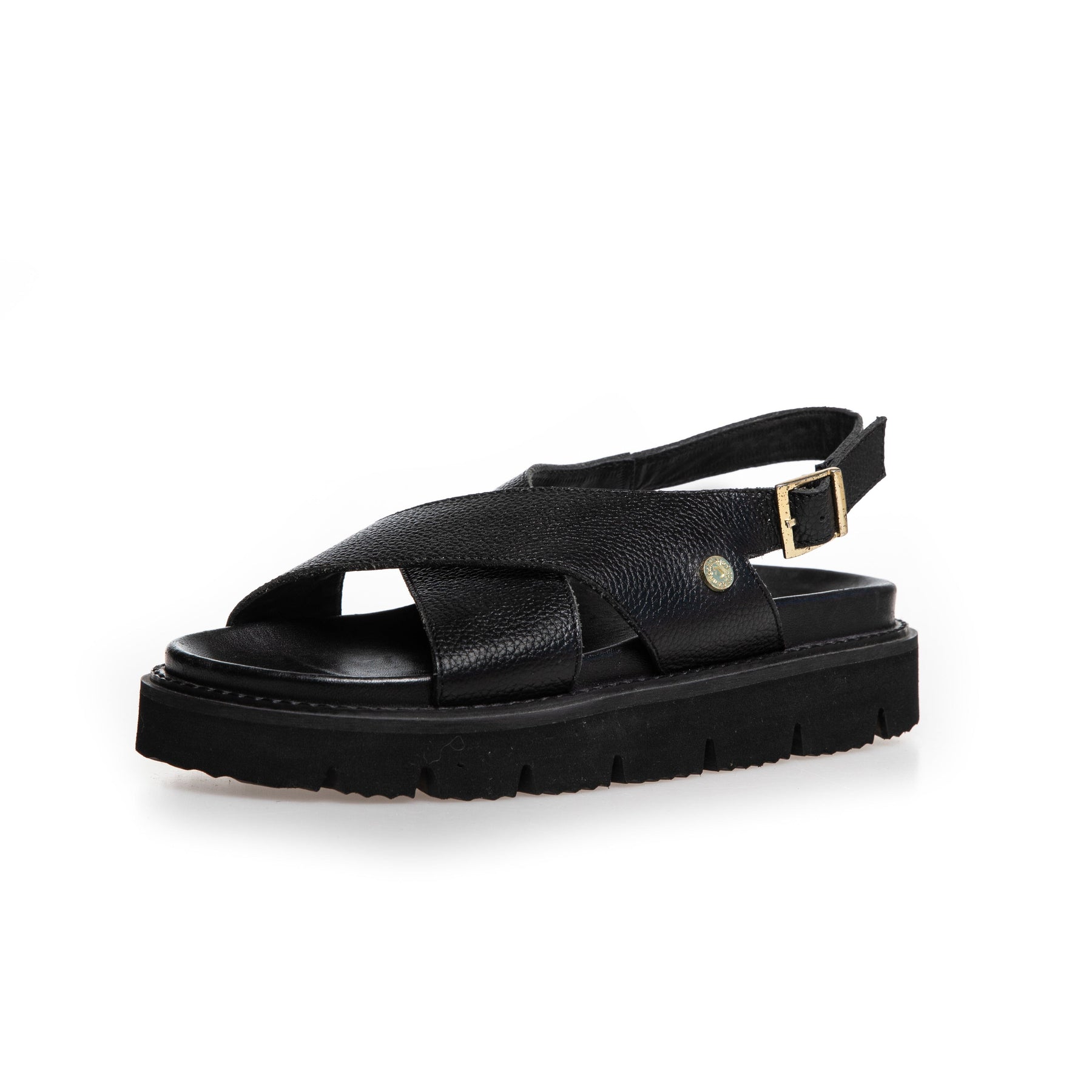 Sandales en cuir noires de Copenhagen Shoes avec design croisé sur le pied. Les sandales ont une boucle dorée sur la sangle du talon et des semelles en EVA avec un bon amorti.