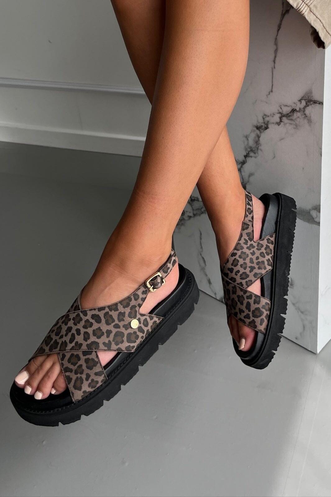 Sandales de Copenhagen Shoes en daim avec motif léopard noir et brun. Les sandales ont des brides croisées sur le pied et une fermeture à boucle pratique au niveau de la cheville.