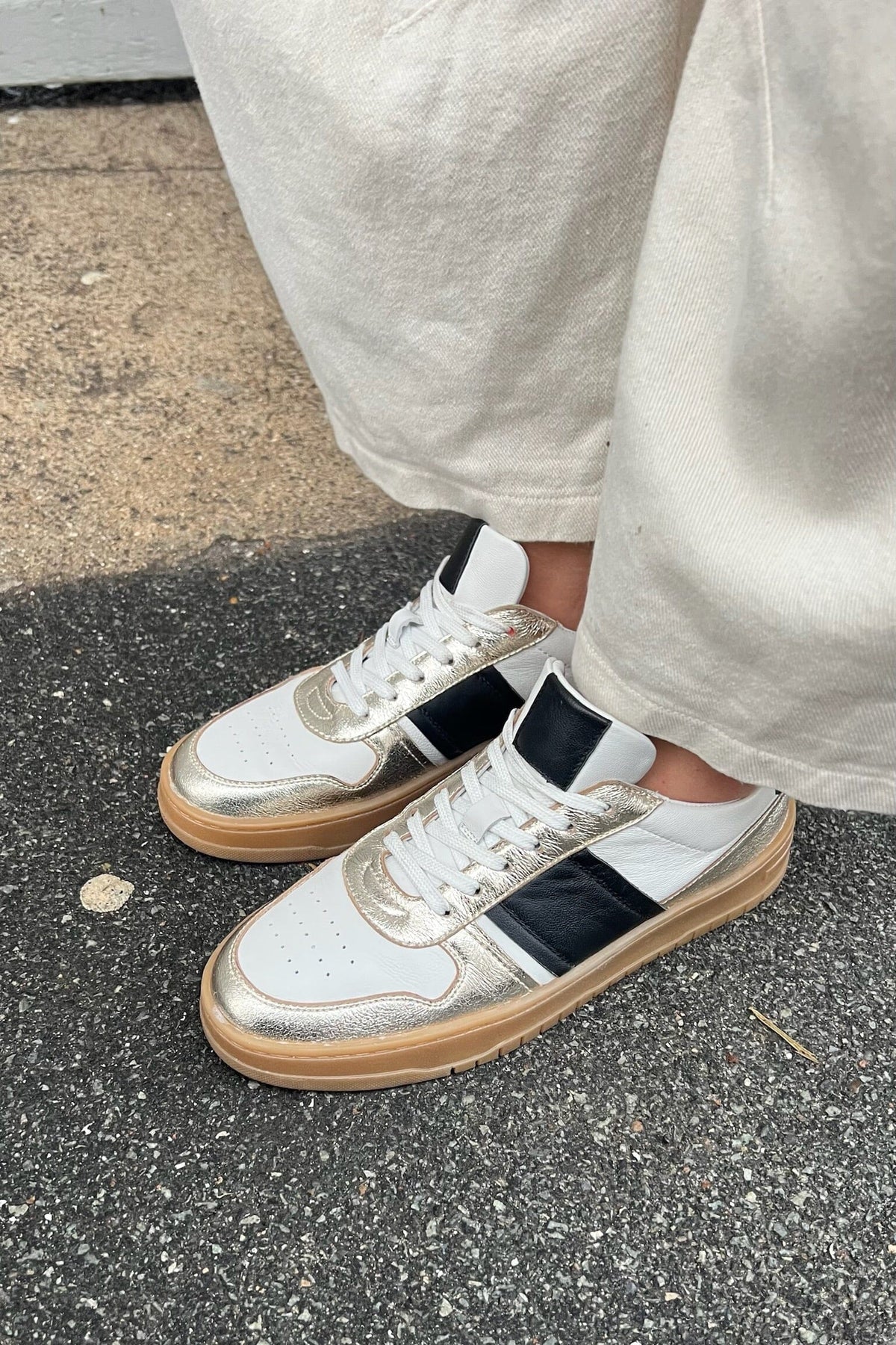 Baskets de Copenhagen Shoes en cuir argenté. La chaussure présente des empiècements argentés et blancs avec une bande noire sur le côté et une épaisse semelle marron.