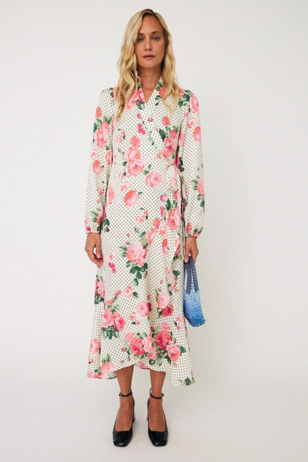Robe longue de Cras dans une nuance crème avec des fleurs roses et des pois noirs. La robe a un design croisé avec une ceinture à nouer à la taille.