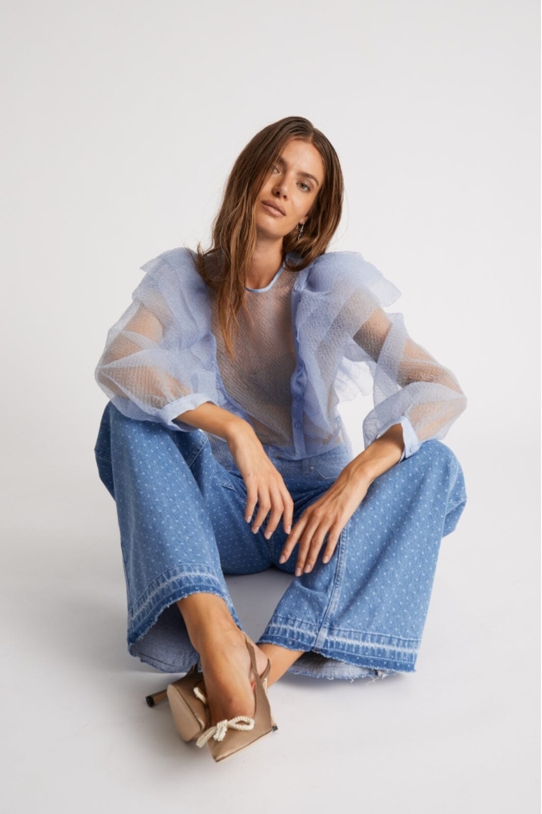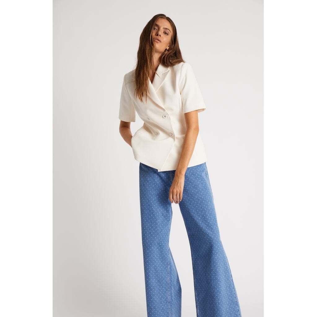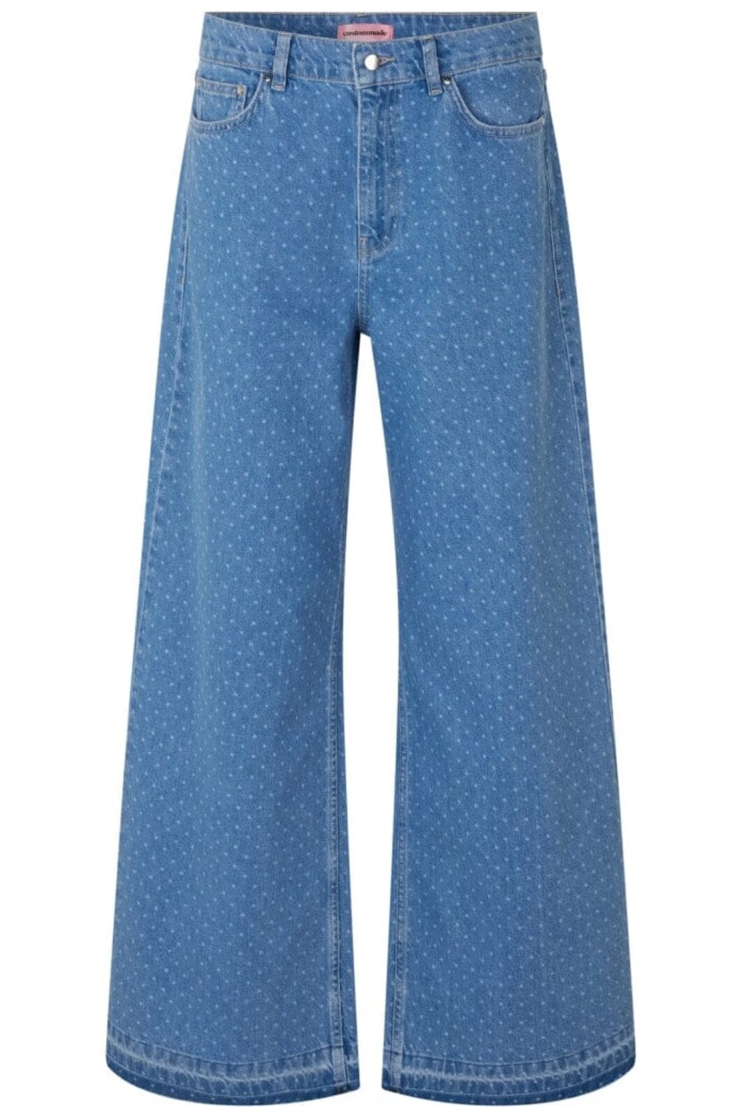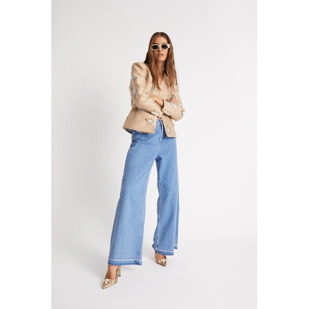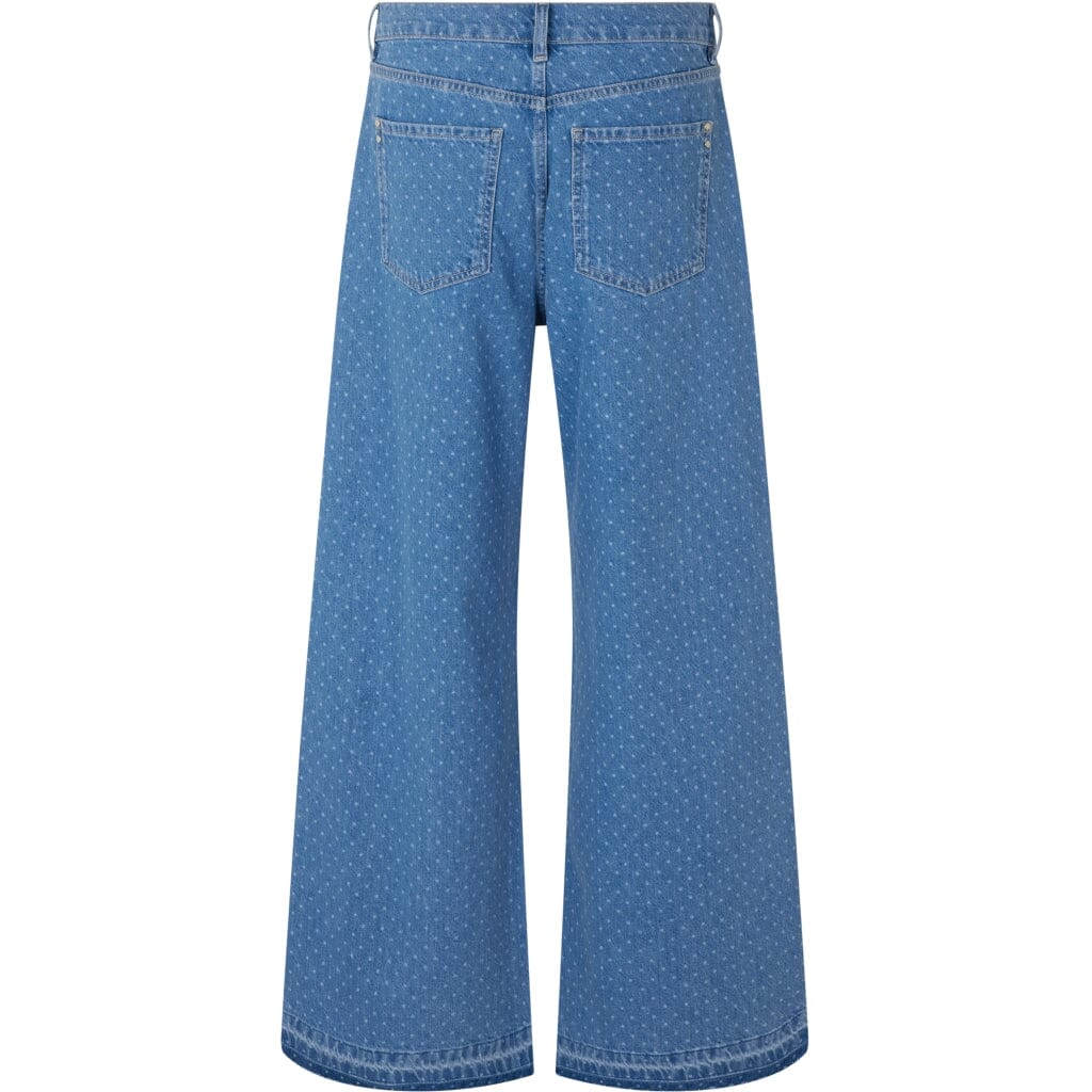 Jeans évasés en bleu clair avec un motif à pois. Les jeans ont une coupe regular et une longueur cheville avec un design à pois discret qui couvre tout le tissu.