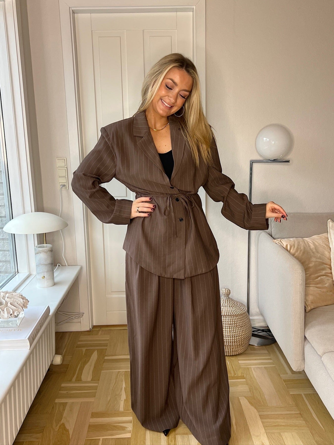 Pantalon marron Dear Molly à motif rayé. Le pantalon est en matière tissée et présente une longueur jusqu’au sol avec taille haute et lien à nouer.