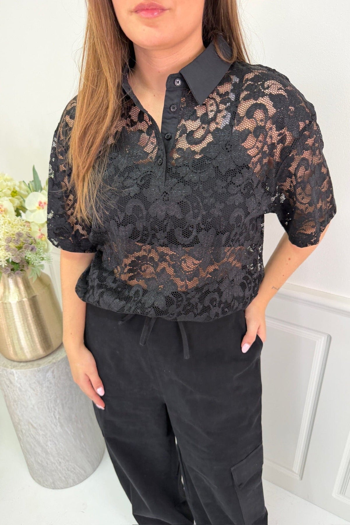 Polo noir de Dear Molly avec broderie et détails en dentelle. La chemise a des manches courtes et une fermeture boutonnée au col.