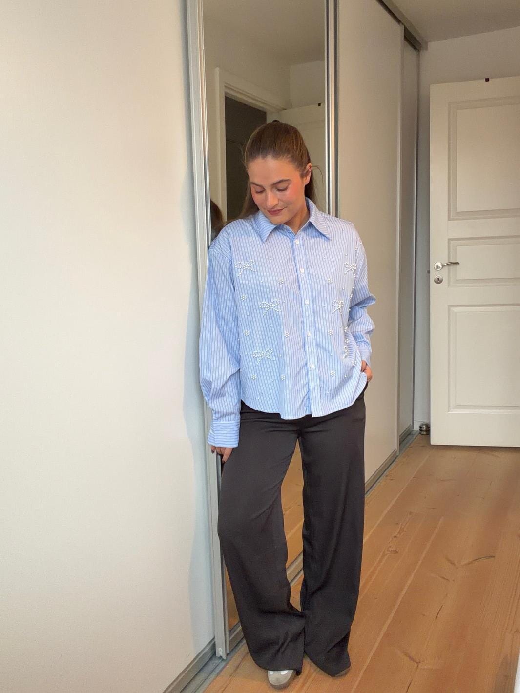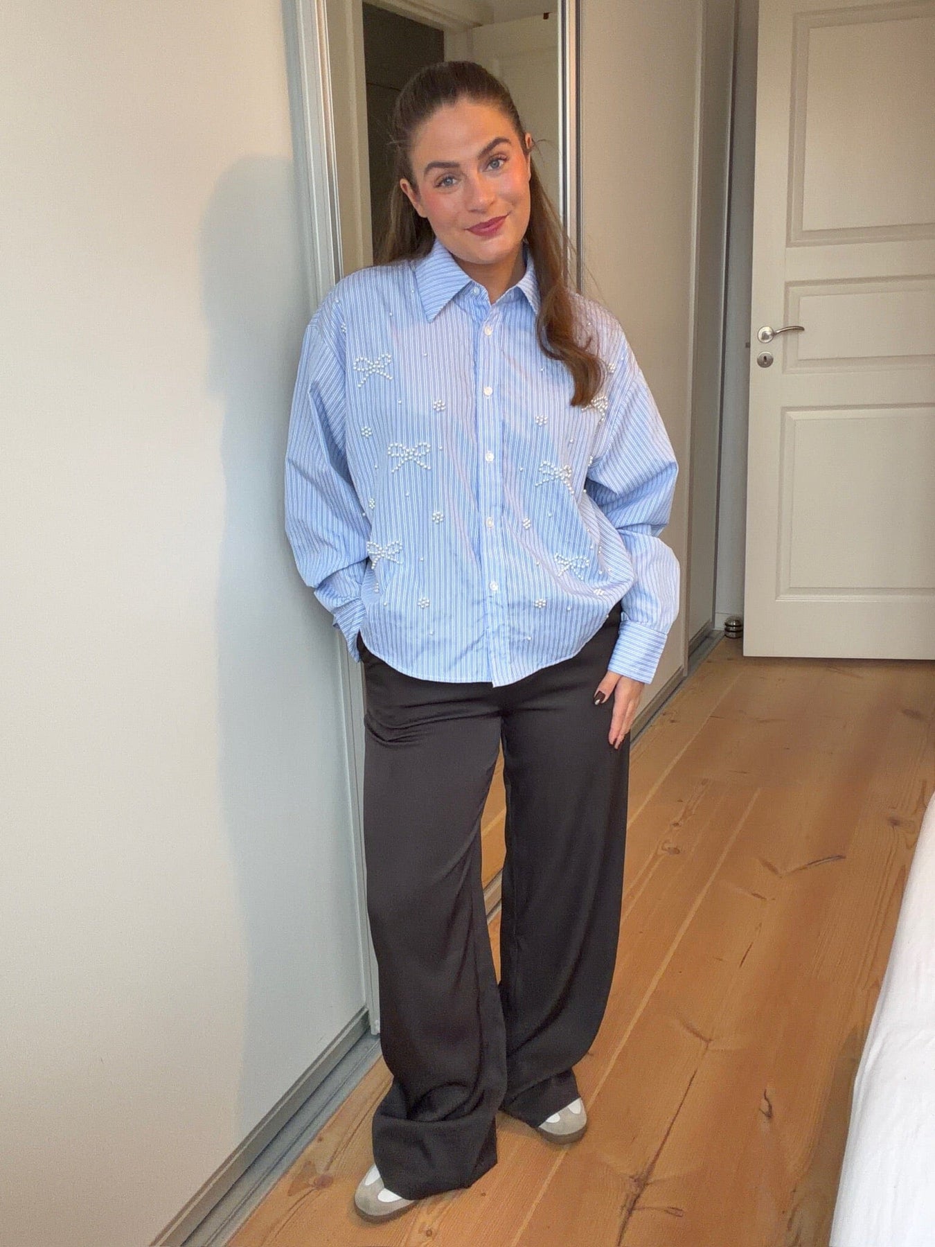 Pantalon marron de Dear Molly avec une coupe longue et droite. Le pantalon a une taille haute et une coupe ample.