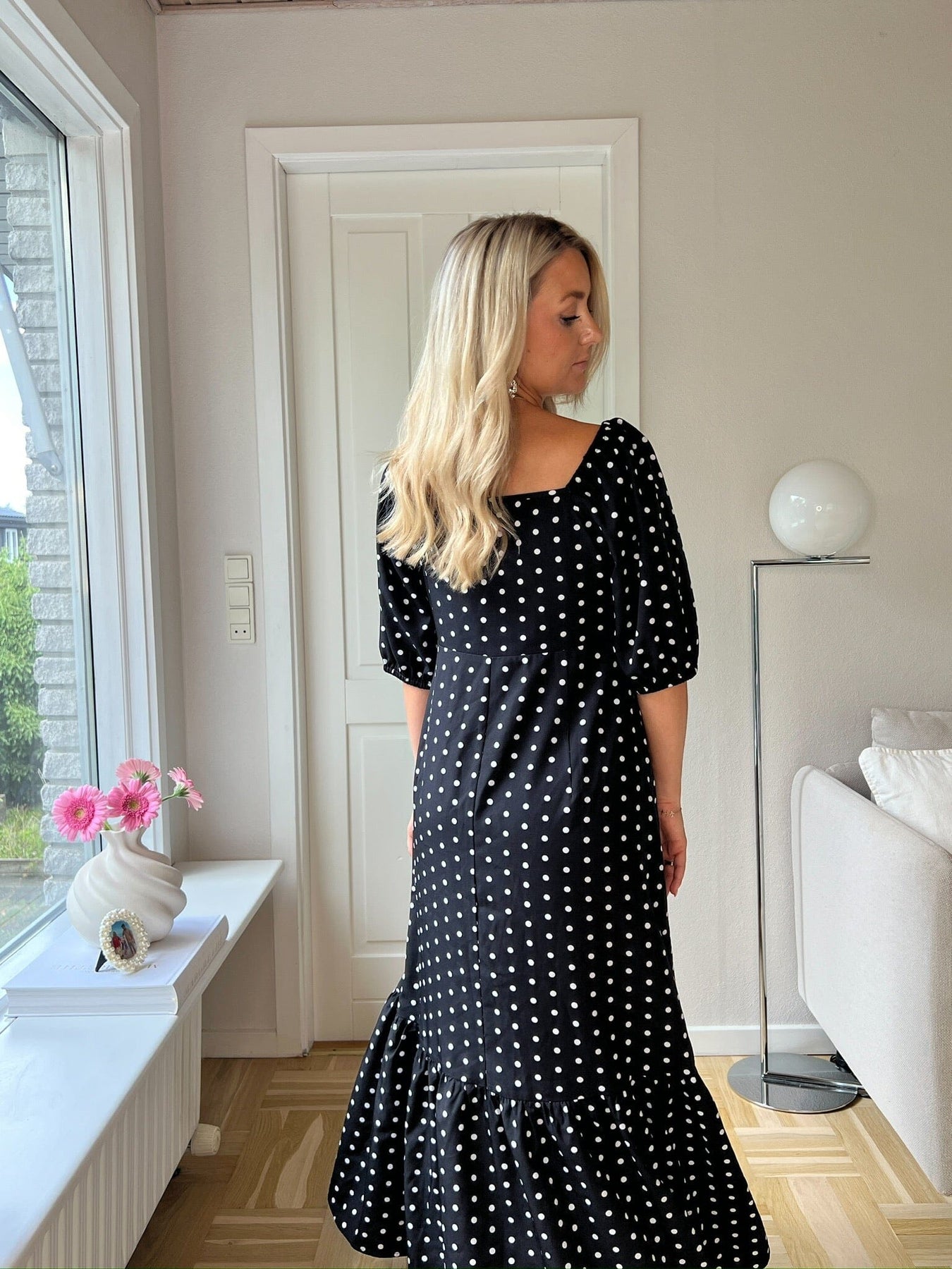 Robe noire longueur cheville avec des pois blancs. Le décolleté carré et les manches 3/4 donnent à la robe une expression épurée et simple. L'ourlet volanté en bas crée du mouvement dans la coupe ample.