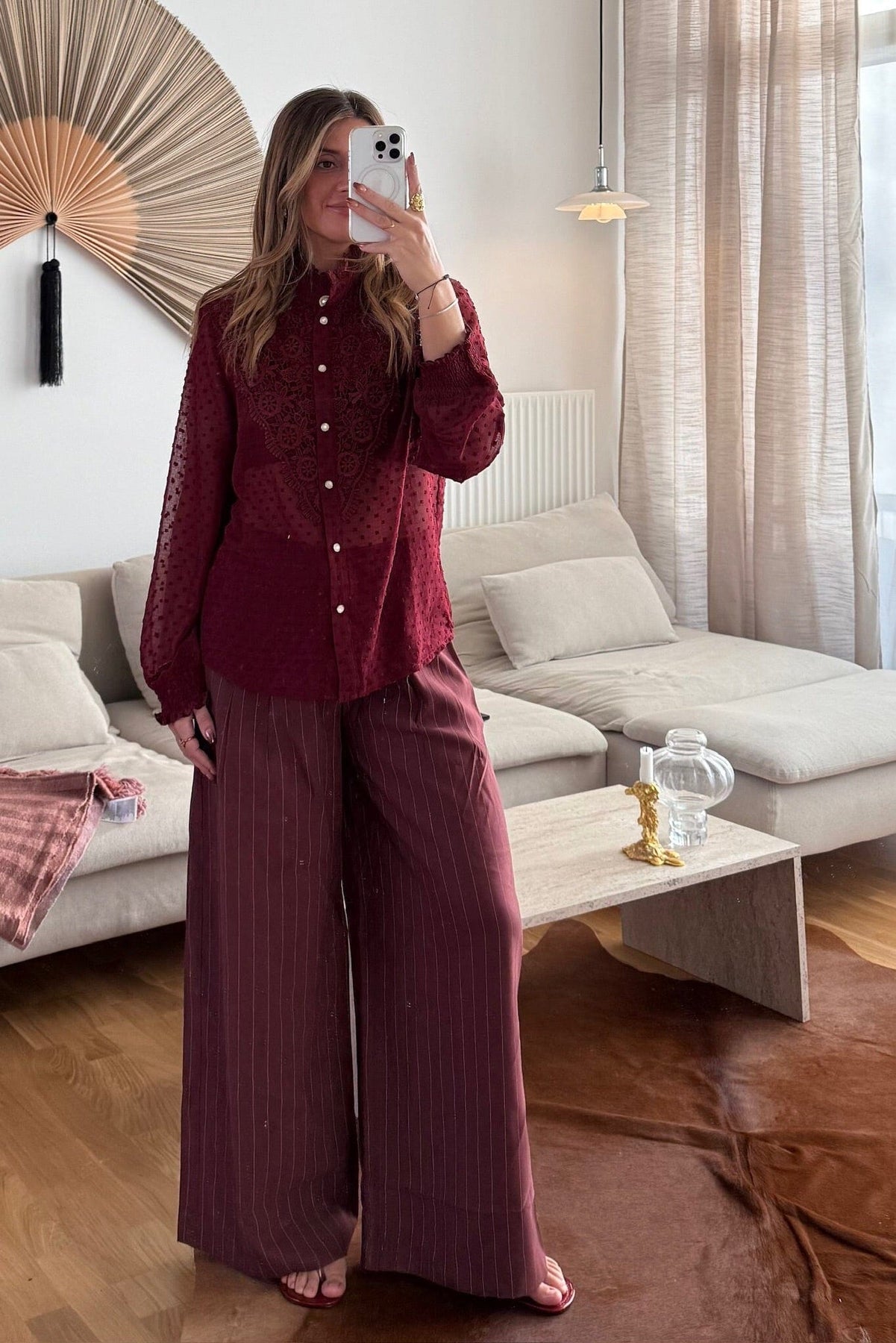 Chemisier bordeaux de Dear Molly avec motifs floraux et à pois. Le chemisier présente des broderies, des détails en perles et des volants, et se ferme avec des boutons.