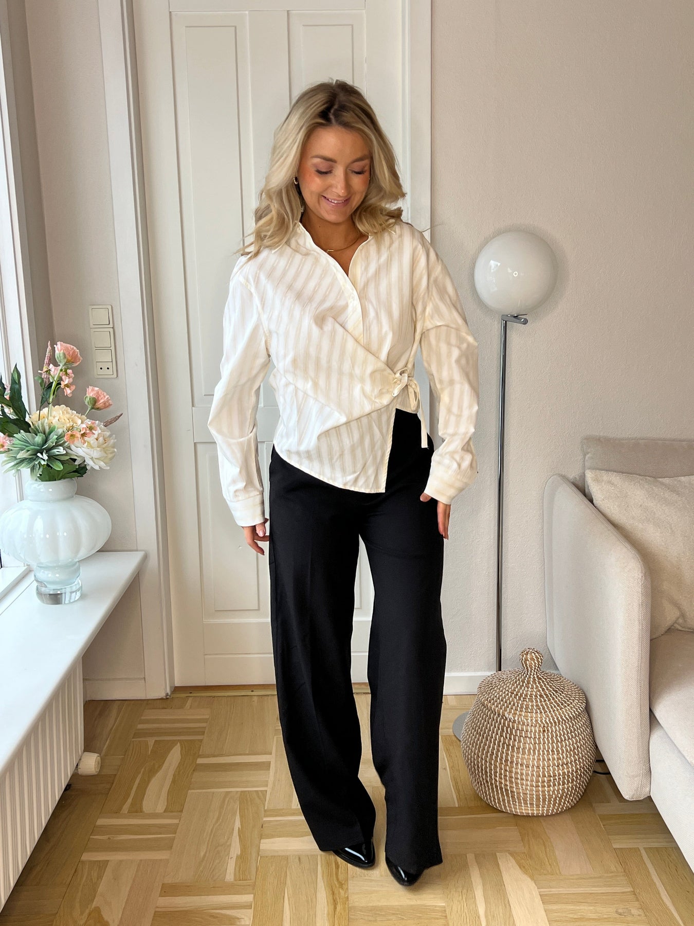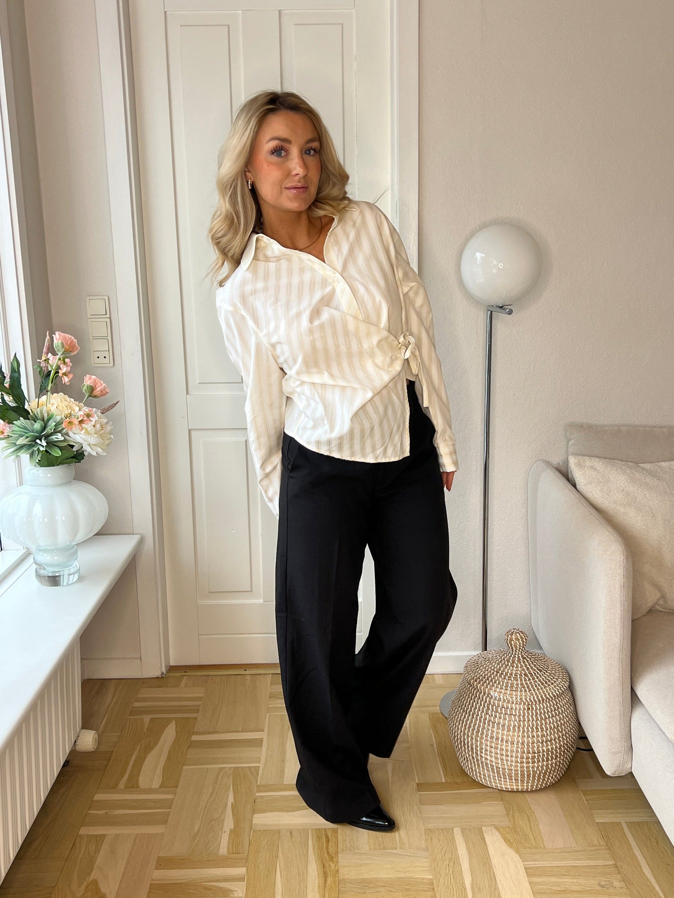 Une chemise rayée Dear Molly crème et blanche. La chemise possède des manches longues, un col chemise et une combinaison de boutons et de laçage.