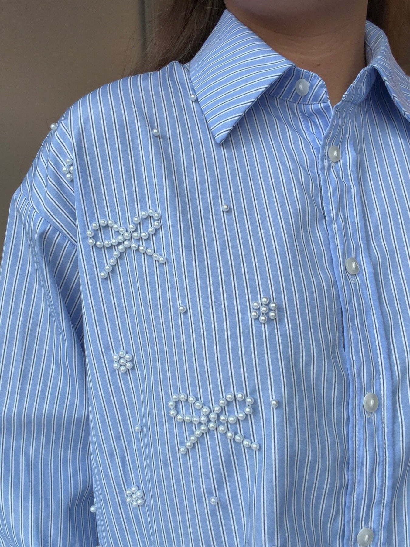 Chemise Dear Molly bleu clair à rayures blanches. Les nœuds en perles sont disposés sur l’ensemble de la chemise et lui confèrent une allure décorative. Elle convient aussi bien aux occasions formelles que décontractées.