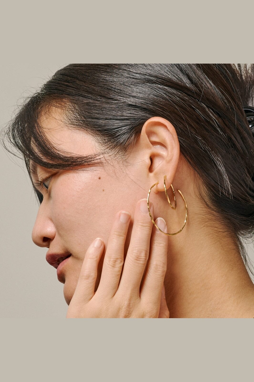 Grandes créoles de Enamel Copenhagen, en argent sterling recyclé plaqué or 18K avec une finition martelée dorée.