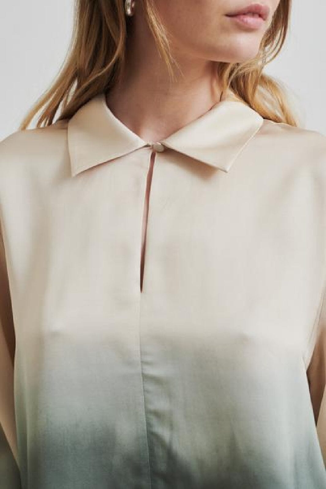 Blouse de Second Female avec un dégradé de couleur allant de la crème au vert. La blouse a un col de chemise et des manches longues avec des boutons à l'avant.
